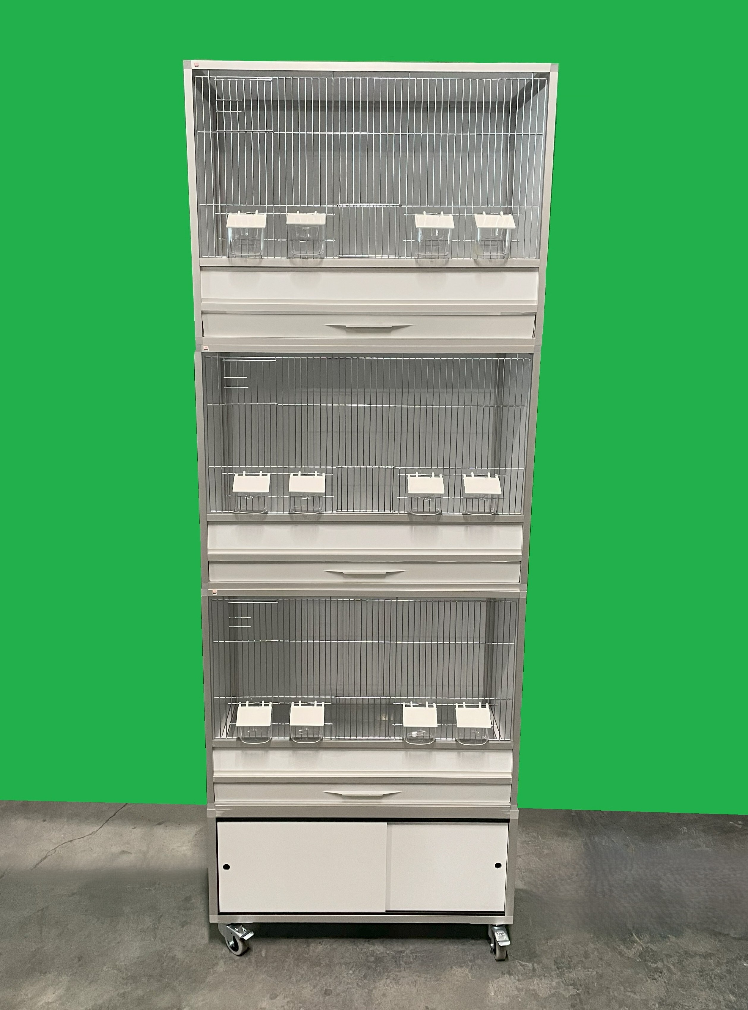 Każda klatka jest oddzielna i jest umieszczona albo bezpośrednio na podwoziu, albo na drugiej klatce, gdzie stabilność klatki utrzymuje dodatkowy profil. Wypełnienia ścian wykonane są z aluminiowego sandwichu, który jest osadzony w ramie klatki. Aluminiowy sandwich to bardzo wytrzymały, solidny materiał, który można wiercić, ciąć. Klatkę skrzyniową można wybrać w kolorze białym, srebrnym, zielonym, antracytowym, żółtym i czarnym, gdzie od wewnętrznej strony jest kolor biały. Wymiary pojedynczej klatki to w 54 x sz 72,5 x g 41 cm. Cała konstrukcja ma wymiary 205 cm wysokości, 72,5 cm szerokości i 41 cm głębokości. Te klatki skrzyniowe są bardzo wytrzymałe. Można je nie tylko myć gorącą wodą, ale można również używać różnych środków dezynfekujących. Te klatki zapewniają nie tylko zdrową hodowlę, ale także będą służyć pokoleniom.