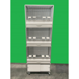 Zestaw trzech klatek skrzyniowych plus podwozie z szafką na przechowywanie.