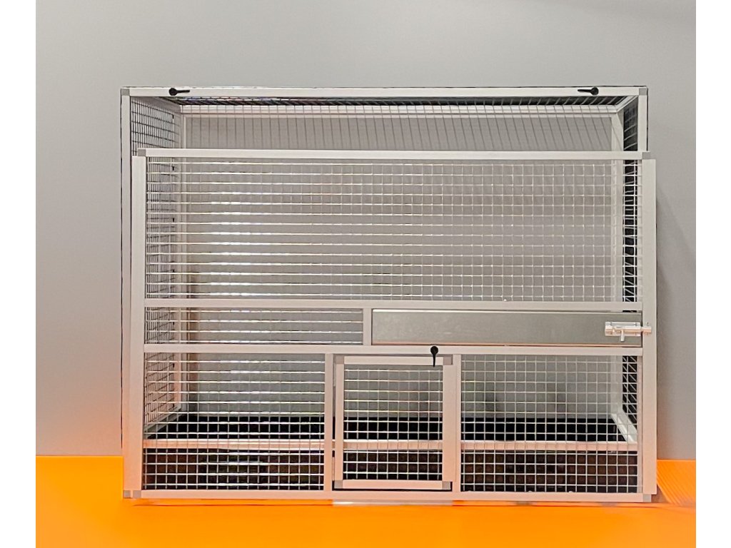 Aluminiowa konstrukcja z wykończeniem powierzchni srebrnym anodowaniem. Wypełnienia klatki są z aluminiowego sandwichu (aluminium-plastik-aluminium). To jest bardzo mocny i wysokiej jakości materiał. Może być w kolorze białym, szarym, ciemnozielonym i antracytowym. Na życzenie również w kolorze czarnym. Sufit jest pokryty siatką, na życzenie można zrobić pełny sufit. W przedniej ścianie znajduje się obrotowy stół paszowy u nas oznaczony jako KMP03. Jest to karmnik z trzema miskami o pojemności 0,35l. Częścią klatki nie jest poidło. Dodatki można zamówić https://www.aluhobby.pl/ptactwo/akcesoria-do-klatek-skrzyniowych/. Główną zaletą tej klatki skrzyniowej jest przede wszystkim niska waga 14 kg i wysoka wytrzymałość. Dzięki niskiej wadze i użytym materiałom, bardzo łatwo jest utrzymać higienę w hodowli.Wierzymy, że te klatki będą służyć pokoleniom.