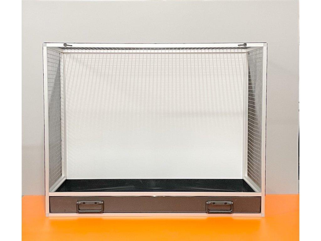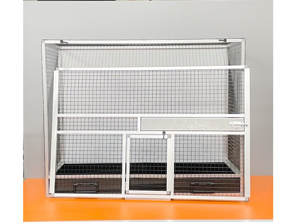 To nie jest siatka powlekana plastikiem!! Z tego powodu zwierzęta nie są w stanie uszkodzić lakieru. Widok na zwierzęta przez ten rodzaj siatki jest bardzo przyjemny i niezakłócony srebrnym połyskiem. Klatka skrzyniowa o wymiarach szerokość 99 cm, głębokość 50 cm i wysokość 78,5 cm ma aluminiową konstrukcję wykonaną z profilu 15x15mm. Aluminiowa konstrukcja z wykończeniem powierzchni srebrnym anodowaniem. Wypełnienia klatki są z aluminiowego sandwichu (aluminium-plastik-aluminium). To jest bardzo mocny i wysokiej jakości materiał. Może być w kolorze białym, szarym, ciemnozielonym i antracytowym. Na życzenie również w kolorze czarnym. Sufit jest pokryty siatką, na życzenie można zrobić pełny sufit. W przedniej ścianie znajduje się obrotowy stół paszowy u nas oznaczony jako KMP03. Jest to karmnik z trzema miskami o pojemności 0,35l. Częścią klatki nie jest poidło. Dodatki można zamówić https://www.aluhobby.pl/ptactwo/akcesoria-do-klatek-skrzyniowych/. Główną zaletą tej klatki skrzyniowej jest przede wszystkim niska waga 14 kg i wysoka wytrzymałość. Dzięki niskiej wadze i użytym materiałom, bardzo łatwo jest utrzymać higienę w hodowli.Parametry dodatkowe