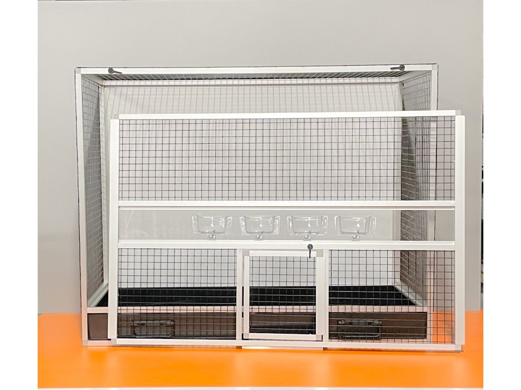 To nie jest siatka powlekana plastikiem!! Z tego powodu zwierzęta nie są w stanie uszkodzić lakieru. Widok na zwierzęta przez ten rodzaj siatki jest bardzo przyjemny i niezakłócony srebrnym połyskiem. Klatka skrzyniowa o wymiarach szerokość 99 cm, głębokość 50 cm i wysokość 78,5 cm ma aluminiową konstrukcję wykonaną z profilu 15x15 mm. Aluminiowa konstrukcja z wykończeniem powierzchni srebrnym anodowaniem. Wypełnienia klatki są wykonane z aluminiowego sandwichu (aluminium-plastik-aluminium). To jest bardzo mocny i wysokiej jakości materiał. Może być w kolorze białym, szarym, ciemnozielonym i antracytowym. Na życzenie również w kolorze czarnym. Sufit jest pokryty siatką, na życzenie można zrobić pełny sufit. Przednia ściana składa się z wyjmowanej kratki z czterema karmnikami. Częścią klatki nie jest poidło. Dodatki można zamówić https://www.aluhobby.pl/ptactwo/akcesoria-do-klatek-skrzyniowych/. Główną zaletą tej klatki skrzyniowej jest przede wszystkim niska waga 14 kg i wysoka wytrzymałość. Dzięki niskiej wadze i użytym materiałom, higiena w hodowli jest bardzo łatwa do utrzymania.Wierzymy, że te klatki będą służyć pokoleniom.
