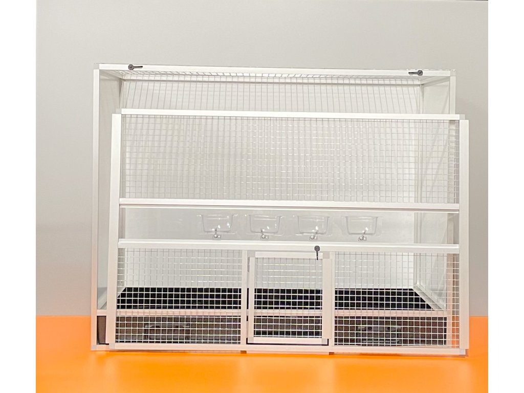 Tylko przednia strona i sufit mają siatkę.Klatka skrzyniowa o wymiarach szerokość 99 cm, głębokość 50 cm i wysokość 78,5 cm ma aluminiową konstrukcję wykonaną z profilu 15x15mm.