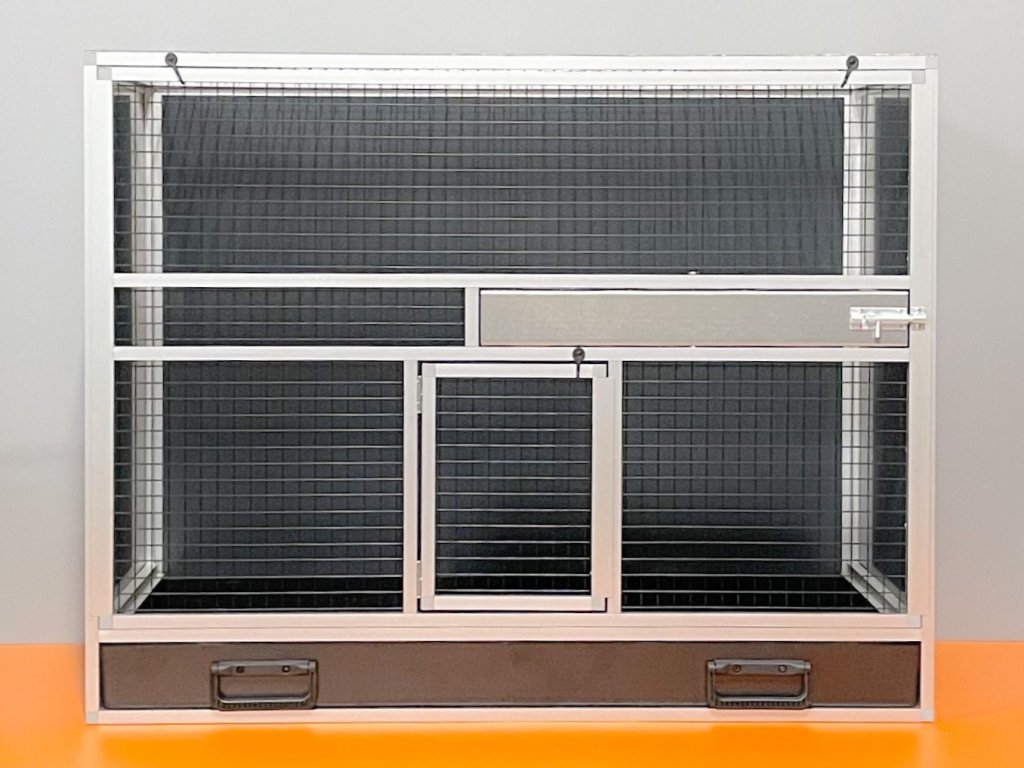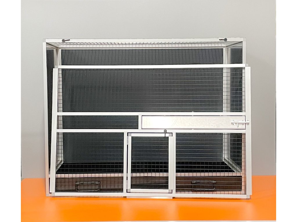 To nie jest siatka powlekana plastikiem!! Z tego powodu zwierzęta nie są w stanie uszkodzić lakieru. Widok na zwierzęta przez ten rodzaj siatki jest bardzo przyjemny i niezakłócony srebrnym połyskiem. Klatka skrzyniowa o wymiarach szerokość 99 cm, głębokość 50 cm i wysokość 78,5 cm ma aluminiową konstrukcję wykonaną z profilu 15x15mm. Aluminiowa konstrukcja z wykończeniem powierzchni srebrnym anodowaniem. Wypełnienia klatki są z aluminiowego sandwichu (aluminium-plastik-aluminium). To jest bardzo mocny i wysokiej jakości materiał. Może być w kolorze białym, szarym, ciemnozielonym i antracytowym. Na życzenie również w kolorze czarnym. Sufit jest pokryty siatką, na życzenie można zrobić pełny sufit. W przedniej ścianie znajduje się obrotowy stół paszowy u nas oznaczony jako KMP03. Jest to karmnik z trzema miskami o pojemności 0,35l. Częścią klatki nie jest poidło. Dodatki można zamówić https://www.aluhobby.pl/ptactwo/akcesoria-do-klatek-skrzyniowych/. Główną zaletą tej klatki skrzyniowej jest przede wszystkim niska waga 14 kg i wysoka wytrzymałość. Dzięki niskiej wadze i użytym materiałom, bardzo łatwo jest utrzymać higienę w hodowli.Parametry dodatkowe