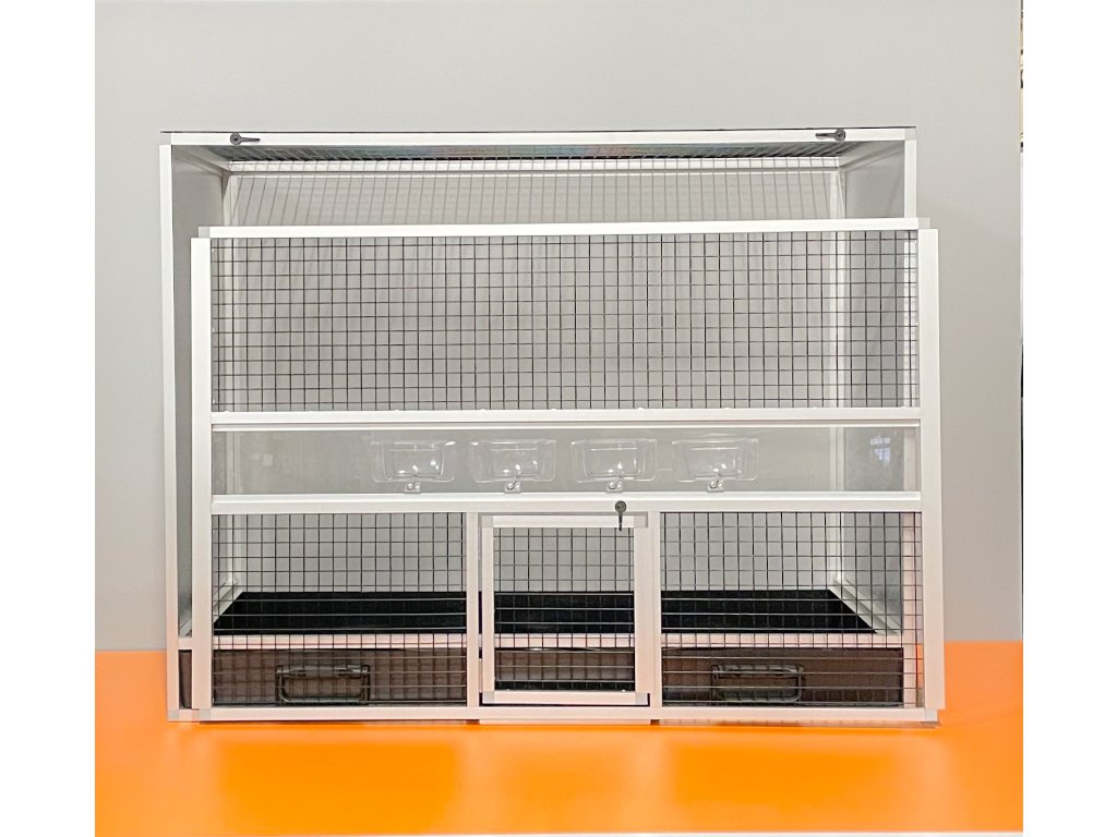 To nie jest siatka powlekana plastikiem!! Z tego powodu zwierzęta nie są w stanie uszkodzić lakieru. Widok na zwierzęta przez ten rodzaj siatki jest bardzo przyjemny i niezakłócony srebrnym połyskiem. Klatka skrzyniowa o wymiarach szerokość 99 cm, głębokość 50 cm i wysokość 78,5 cm ma aluminiową konstrukcję wykonaną z profilu 15x15 mm. Aluminiowa konstrukcja z wykończeniem powierzchni srebrnym anodowaniem. Wypełnienia klatki są wykonane z aluminiowego sandwichu (aluminium-plastik-aluminium). To jest bardzo mocny i wysokiej jakości materiał. Może być w kolorze białym, szarym, ciemnozielonym i antracytowym. Na życzenie również w kolorze czarnym. Sufit jest pokryty siatką, na życzenie można zrobić pełny sufit. Przednia ściana składa się z wyjmowanej kratki z czterema karmnikami. Częścią klatki nie jest poidło. Dodatki można zamówić https://www.aluhobby.pl/ptactwo/akcesoria-do-klatek-skrzyniowych/. Główną zaletą tej klatki skrzyniowej jest przede wszystkim niska waga 14 kg i wysoka wytrzymałość. Dzięki niskiej wadze i użytym materiałom, higiena w hodowli jest bardzo łatwa do utrzymania.