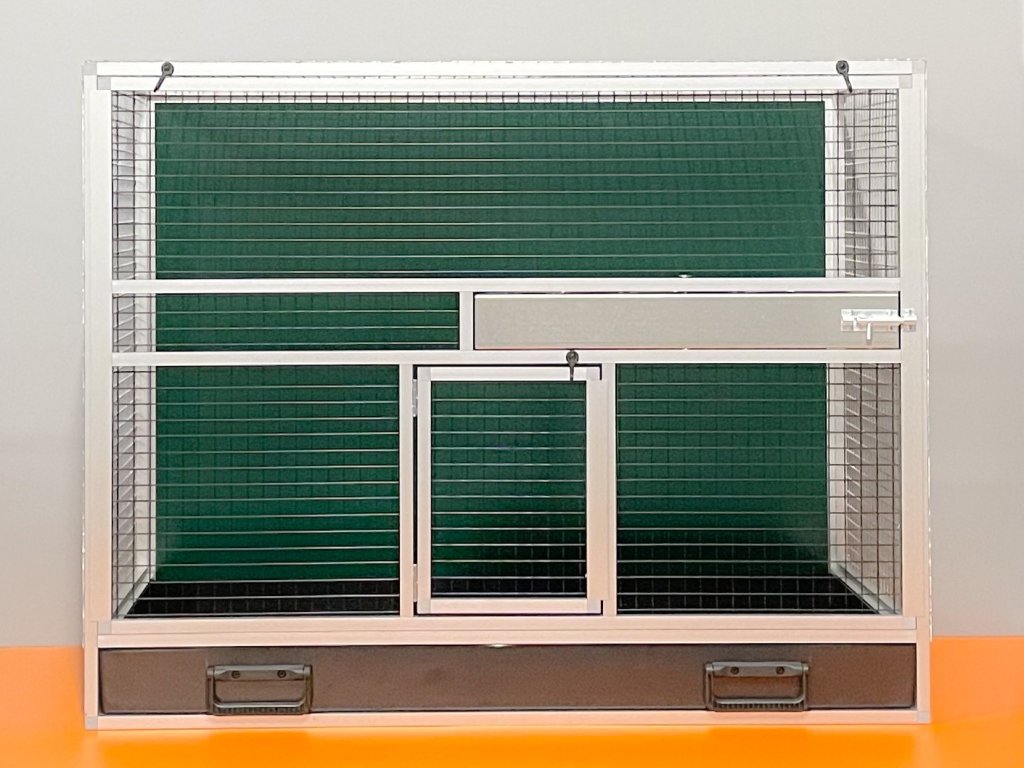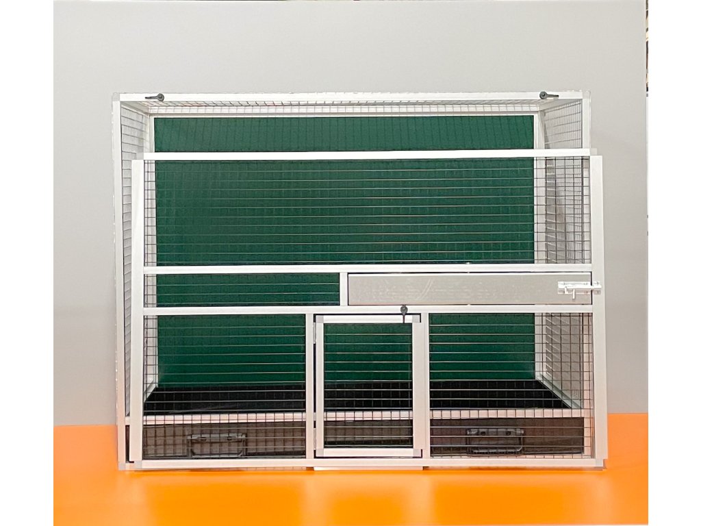 To nie jest siatka powlekana plastikiem!! Z tego powodu zwierzęta nie są w stanie uszkodzić lakieru. Widok na zwierzęta przez ten rodzaj siatki jest bardzo przyjemny i niezakłócony srebrnym połyskiem. Klatka skrzyniowa o wymiarach szerokość 99 cm, głębokość 50 cm i wysokość 78,5 cm ma aluminiową konstrukcję wykonaną z profilu 15x15mm. Aluminiowa konstrukcja z wykończeniem powierzchni srebrnym anodowaniem. Wypełnienia klatki są z aluminiowego sandwichu (aluminium-plastik-aluminium). To jest bardzo mocny i wysokiej jakości materiał. Może być w kolorze białym, szarym, ciemnozielonym i antracytowym. Na życzenie również w kolorze czarnym. Sufit jest pokryty siatką, na życzenie można zrobić pełny sufit. W przedniej ścianie znajduje się obrotowy stół paszowy u nas oznaczony jako KMP03. Jest to karmnik z trzema miskami o pojemności 0,35l. Częścią klatki nie jest poidło. Dodatki można zamówić https://www.aluhobby.pl/ptactwo/akcesoria-do-klatek-skrzyniowych/. Główną zaletą tej klatki skrzyniowej jest przede wszystkim niska waga 14 kg i wysoka wytrzymałość. Dzięki niskiej wadze i użytym materiałom, bardzo łatwo jest utrzymać higienę w hodowli.Parametry dodatkowe