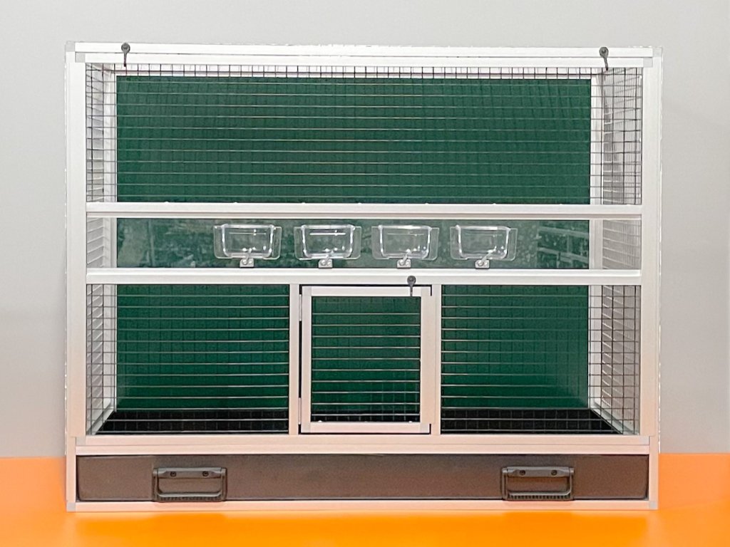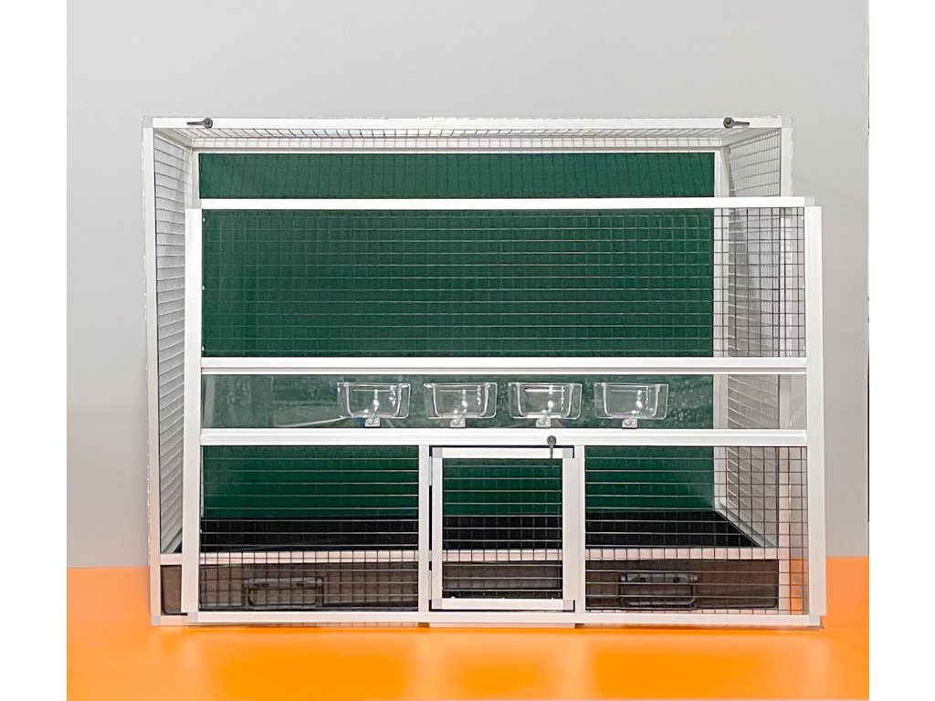 To nie jest siatka powlekana plastikiem!! Z tego powodu zwierzęta nie są w stanie uszkodzić lakieru. Widok na zwierzęta przez ten rodzaj siatki jest bardzo przyjemny i niezakłócony srebrnym połyskiem. Klatka skrzyniowa o wymiarach szerokość 99 cm, głębokość 50 cm i wysokość 78,5 cm ma aluminiową konstrukcję wykonaną z profilu 15x15 mm. Aluminiowa konstrukcja z wykończeniem powierzchni srebrnym anodowaniem. Wypełnienia klatki są wykonane z aluminiowego sandwichu (aluminium-plastik-aluminium). To jest bardzo mocny i wysokiej jakości materiał. Może być w kolorze białym, szarym, ciemnozielonym i antracytowym. Na życzenie również w kolorze czarnym. Sufit jest pokryty siatką, na życzenie można zrobić pełny sufit. Przednia ściana składa się z wyjmowanej kratki z czterema karmnikami. Częścią klatki nie jest poidło. Dodatki można zamówić https://www.aluhobby.pl/ptactwo/akcesoria-do-klatek-skrzyniowych/. Główną zaletą tej klatki skrzyniowej jest przede wszystkim niska waga 14 kg i wysoka wytrzymałość. Dzięki niskiej wadze i użytym materiałom, higiena w hodowli jest bardzo łatwa do utrzymania.Wierzymy, że te klatki będą służyć pokoleniom.