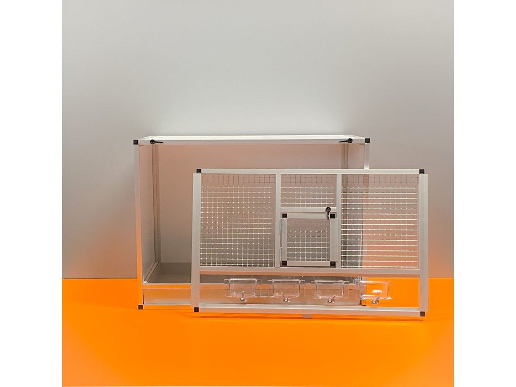 Przednią ścianę można wyjąć. Jest to przede wszystkim z powodów wysokiej jakości konserwacji całej klatki. Ściany tej klatki skrzyniowej są wykonane z bardzo wysokiej jakości materiału aluminiowego sandwich. W ten materiał można ciąć, wiercić. Przednie ściany oferujemy tylko z włoskimi siatkami, w kolorze czarnym matowym oczko 19x19 drut 1,5mm i srebrnym oczko 16x16x1,2 mm. Na życzenie klienta możemy wyprodukować klatkę skrzyniową, w której sufit również będzie pokryty siatką. Jeśli klient zamówi więcej niż cztery klatki jednocześnie, dostawa tych klatek jest bezpłatna. Jeśli klient przyjedzie osobiście, otrzyma 8% rabatu na cztery lub więcej klatek w tym wykonaniu.Parametry dodatkowe