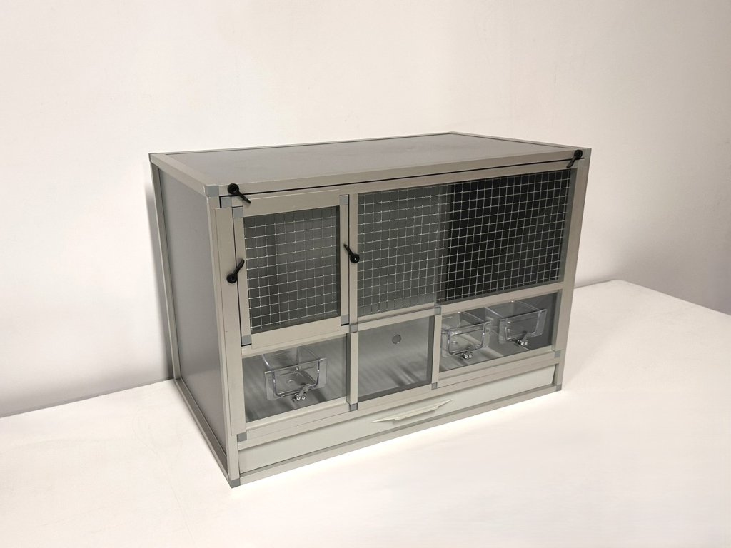 Přední stěnu lze vyjmout. Je to především z důvodu kvalitní údržby celé klece. Stěny této bednové klece jsou z velmi kvalitního materiálu hliníkový sendvič. Do toho materiálu lze řezat, vrtat.