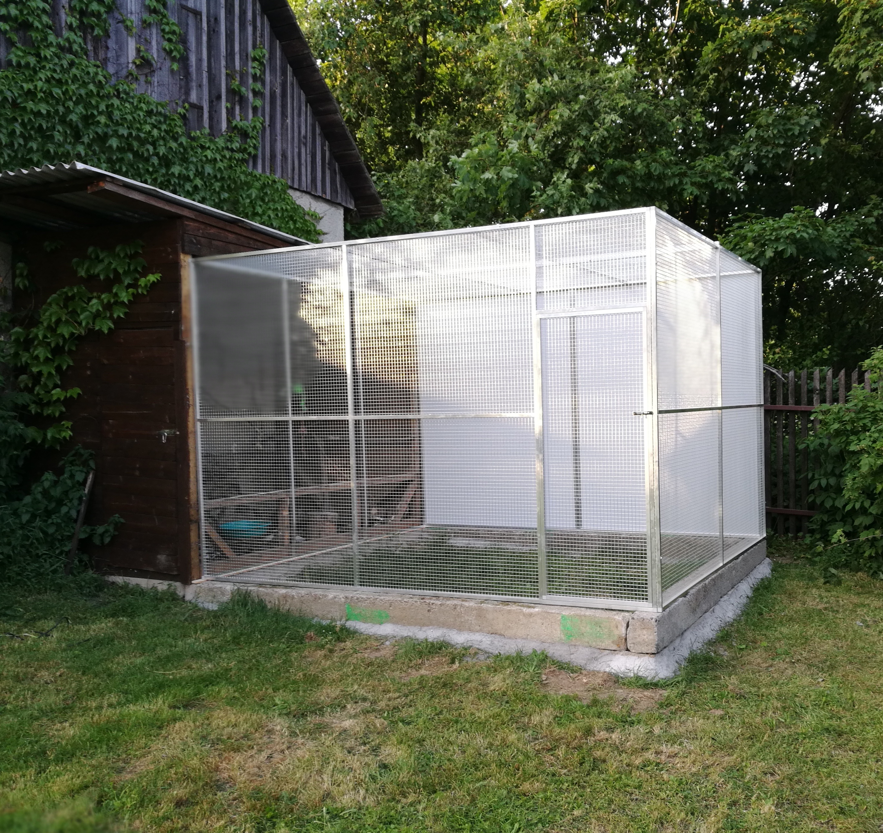 Woliera o wymiarach 300x260 wysokość 200cm przeznaczona do hodowli oswojonego kruka. Woliera została zbudowana na betonowym fundamencie z połączeniem drewnianej wiaty. Hodowczyni sama zaprojektowała ten rozmiar i wygląda na to, że był to dobry wybór.