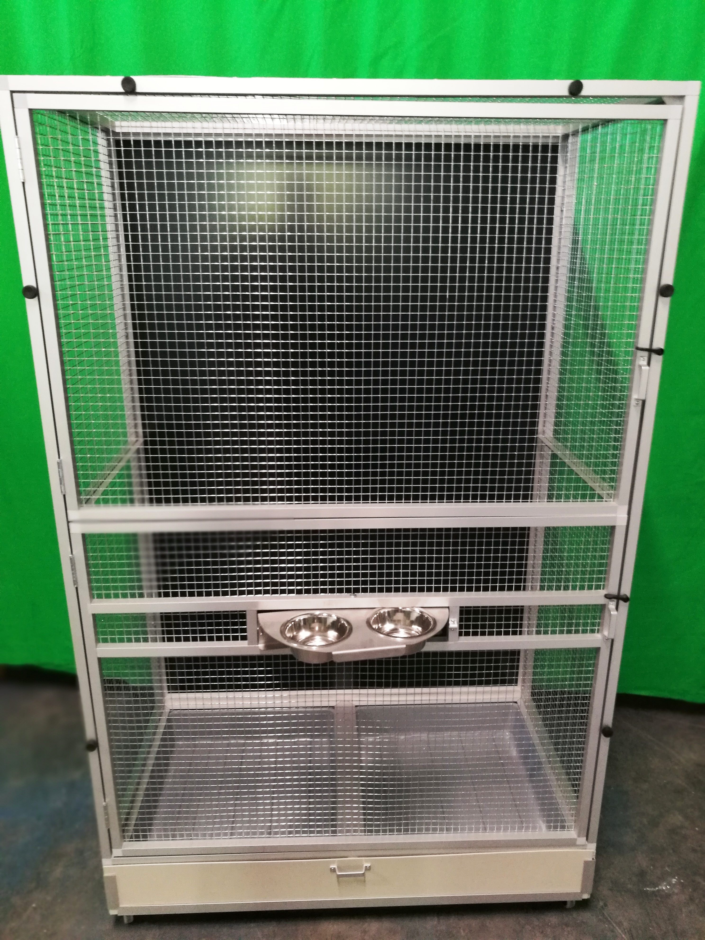 Woliera zbudowana jest na podwoziu Pol2, przednia ściana została zaprojektowana przez samą hodowczynię. Cała przednia ściana może być otwierana. Warunkiem była możliwość podzielenia woliery na pół, gdy pojawią się młode. Hodowca chciał, aby samica miała spokojne miejsce dla swoich młodych i nie musiała przenosić ich do innej klatki. Woliera jest na kółkach. W podwoziu woliery znajdują się dwie wanny. Wymiary woliery 108x60 wysokość 174. Siatka 12,7x12,7 mm drut 1,02mm