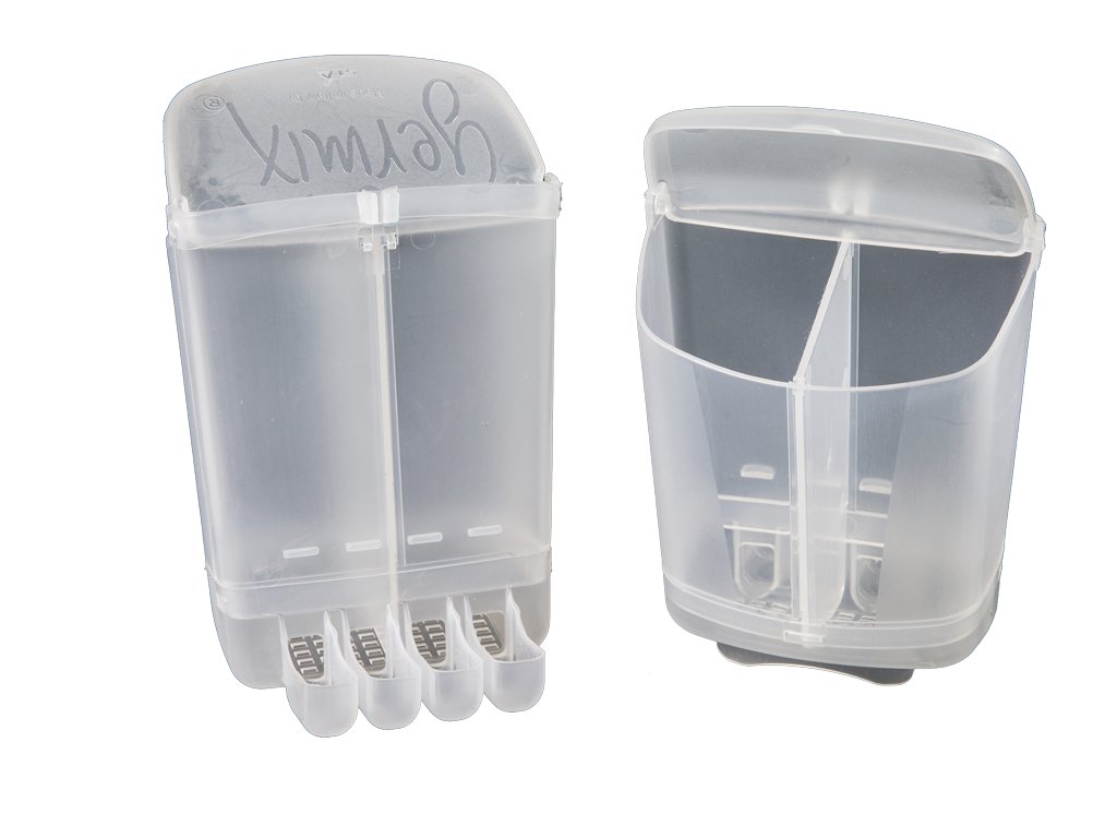 Krmítko s vrchním plněním se čtyřmi rozdělovači potravy, vybavené otvory na spodní straně a dělicí přepážkou pro použití různých druhů potravy.