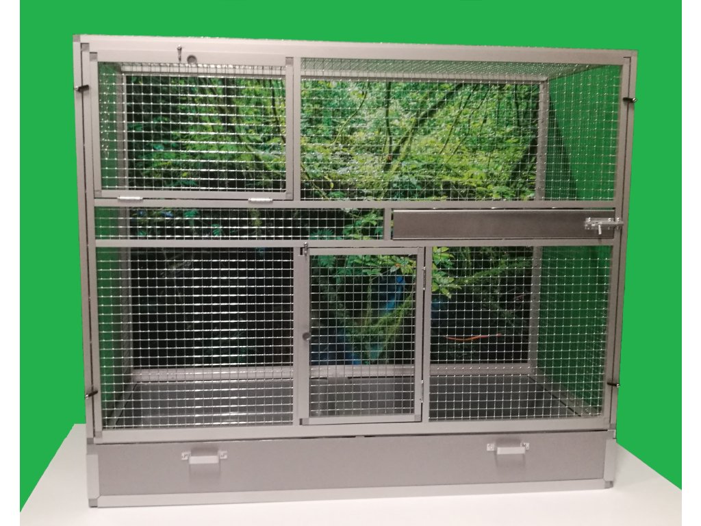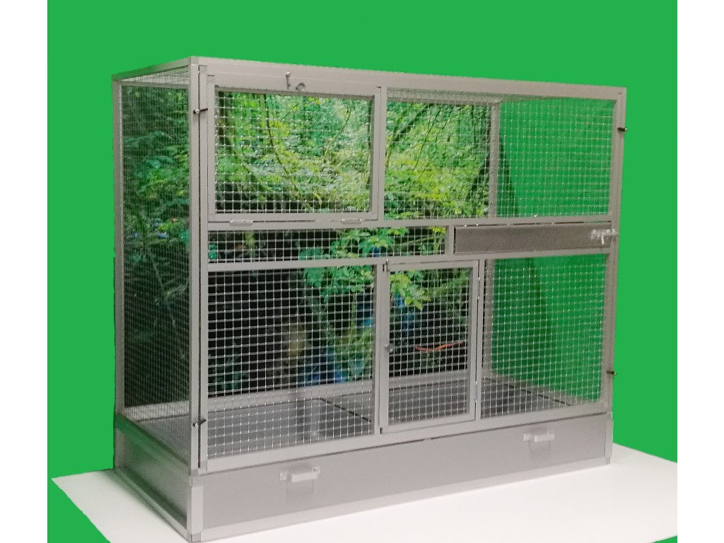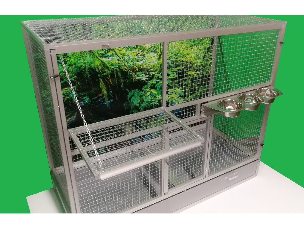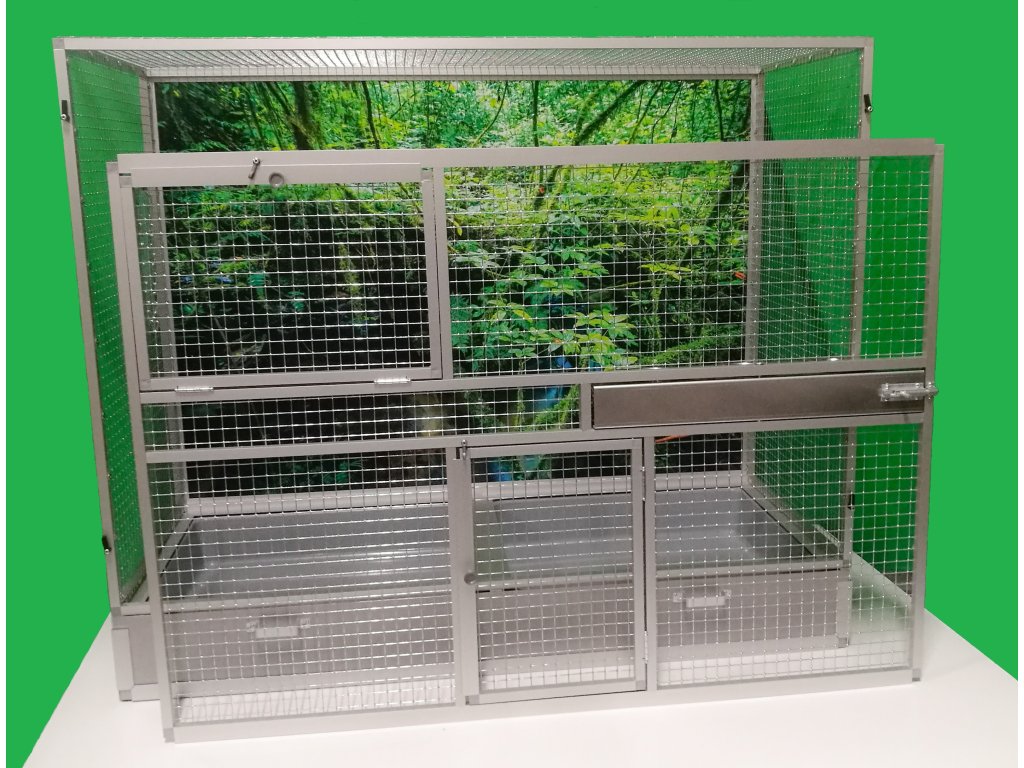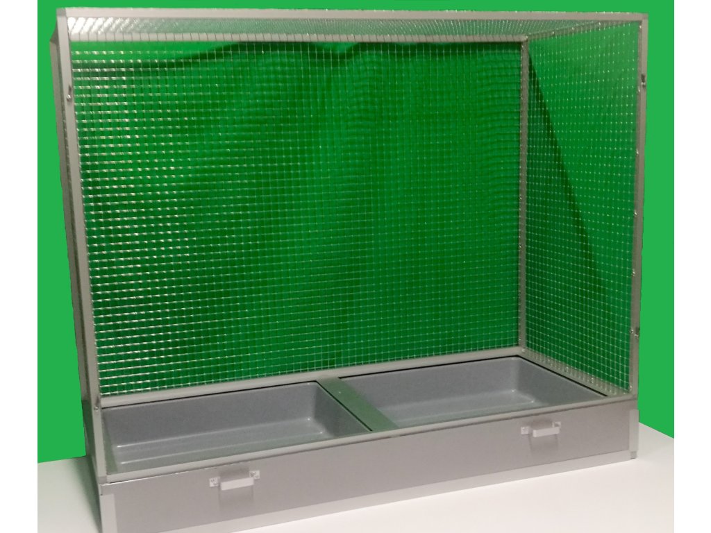 Wymiary to szerokość 120 cm, głębokość 54 cm, wysokość 100 cm. Klatka nie jest rozbieralna, składana. Przednią ścianę można wyjąć z korpusu klatki. To umożliwia lepsze wyczyszczenie klatki, zdezynfekowanie jej, a także w razie potrzeby wymianę przedniej kratki na inną. Tylna ściana może być pokryta siatką. Standardowo oferujemy klatkę z pełną ścianą, która za dodatkową opłatą może być pokryta tapetą. Wybór z pięciu oferowanych wariantów znajdziesz w naszym e-sklepie. Tapeta jest laminowana i tym samym chroniona przed ścieraniem. Klatka jest umieszczona na oddzielnym podwoziu, które jest wyposażone w dwie plastikowe wanienki. Manipulacja wanienkami podczas czyszczenia klatki jest bardzo łatwa. Wanienka ma głębokość 18 cm, co wystarczająco umożliwia utrzymanie porządku wokół woliery. Przednia ściana jest wyposażona w obrotowy stół do karmienia z trzema miskami o pojemności 0,35l. Na naszej stronie ma oznaczenie KPM03. Konstrukcja klatki jest wykonana z aluminiowych profili z powłoką w kolorze srebrnego eloksalu. Użyto jest bardzo wysokiej jakości sprawdzone siatki marki Esafort 16x16x1,20 mm. Waga klatki ok. 18 kg. Na życzenie klienta możemy uzupełnić klatkę o tak zwane pokrywy. Te pokrywy umieszcza się w ramach klatki. Są to oddzielne ramy z pleksi. Plexi są umieszczone w ramie tak, aby umożliwiały zwierzęciu wspinanie się po siatce, a jednocześnie większość zanieczyszczeń pozostawała wewnątrz klatki.Cena tapety wynosi 1500,-Kč.