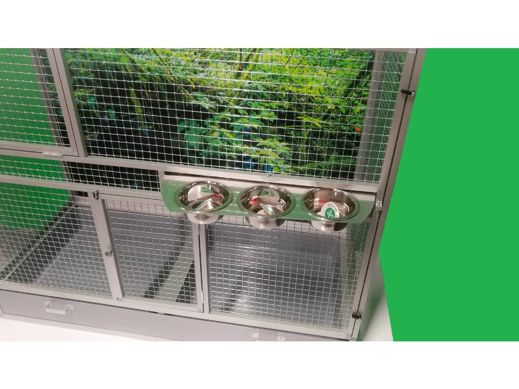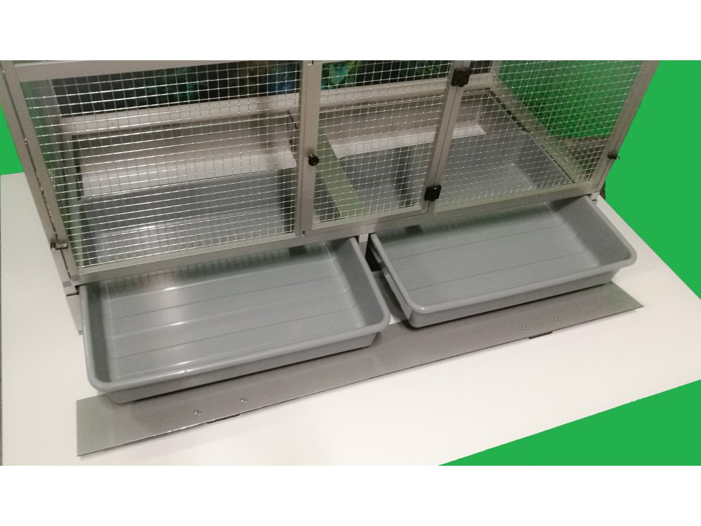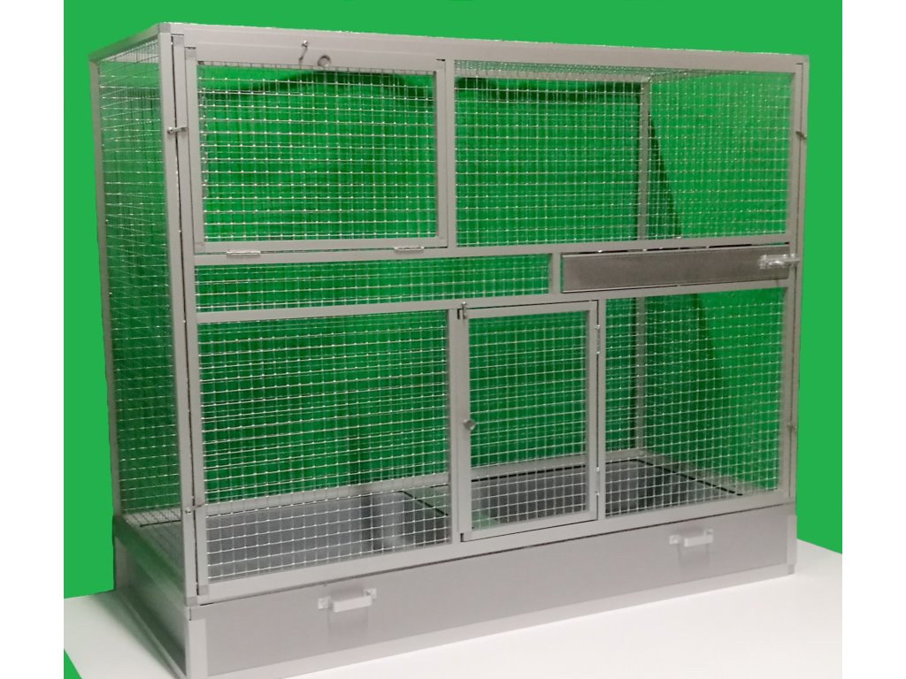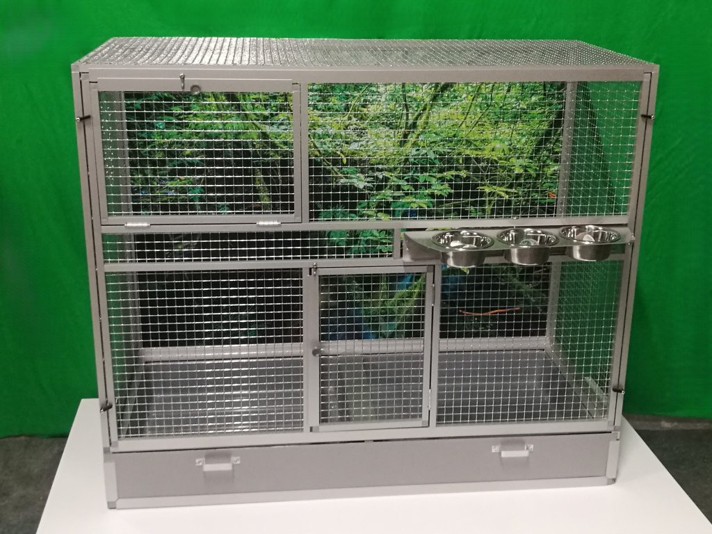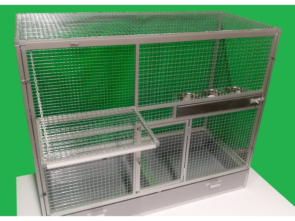 Wymiary to szerokość 120 cm, głębokość 54 cm, wysokość 100 cm. Klatka nie jest rozbieralna, składana. Przednią ścianę można wyjąć z korpusu klatki. To umożliwia lepsze wyczyszczenie klatki, zdezynfekowanie jej, a także w razie potrzeby wymianę przedniej kratki na inną. Tylna ściana może być pokryta siatką. Standardowo oferujemy klatkę z pełną ścianą, która za dodatkową opłatą może być pokryta tapetą. Wybór z pięciu oferowanych wariantów znajdziesz w naszym e-sklepie. Tapeta jest laminowana i tym samym chroniona przed ścieraniem. Klatka jest umieszczona na oddzielnym podwoziu, które jest wyposażone w dwie plastikowe wanienki. Manipulacja wanienkami podczas czyszczenia klatki jest bardzo łatwa. Wanienka ma głębokość 18 cm, co wystarczająco umożliwia utrzymanie porządku wokół woliery. Przednia ściana jest wyposażona w obrotowy stół do karmienia z trzema miskami o pojemności 0,35l. Na naszej stronie ma oznaczenie KPM03. Konstrukcja klatki jest wykonana z aluminiowych profili z powłoką w kolorze srebrnego eloksalu. Użyto jest bardzo wysokiej jakości sprawdzone siatki marki Esafort 16x16x1,20 mm. Waga klatki ok. 18 kg. Na życzenie klienta możemy uzupełnić klatkę o tak zwane pokrywy. Te pokrywy umieszcza się w ramach klatki. Są to oddzielne ramy z pleksi. Plexi są umieszczone w ramie tak, aby umożliwiały zwierzęciu wspinanie się po siatce, a jednocześnie większość zanieczyszczeń pozostawała wewnątrz klatki.Cena tapety wynosi 1500,-Kč.