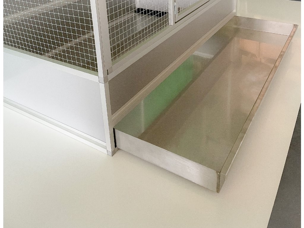 Nierdzewna szuflada w klatce jest niemal niezniszczalna i u gryzoni jest prawie niezbędna. Otwór w klatce jest podzielony na dwoje oddzielnych drzwiczek. Przednia ściana jest wykonana w taki sposób, że można ją łatwo wyjąć z klatki, a całą klatkę można następnie łatwo wyczyścić i zdezynfekować.
