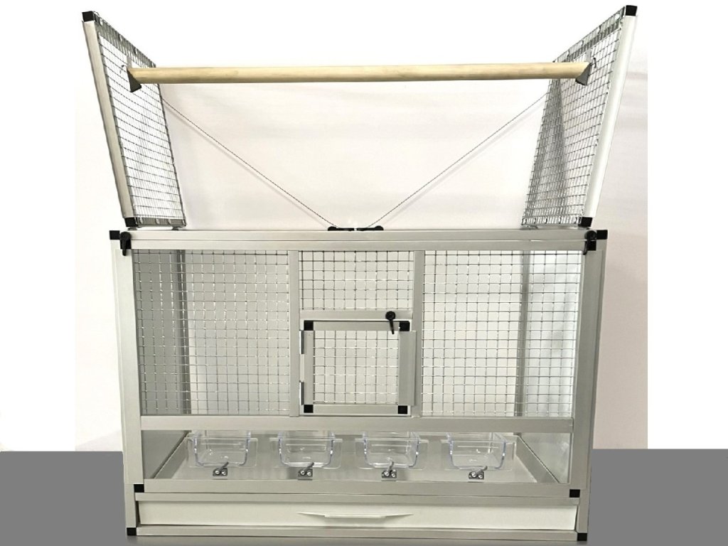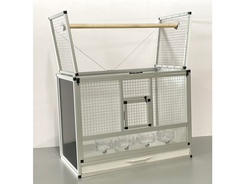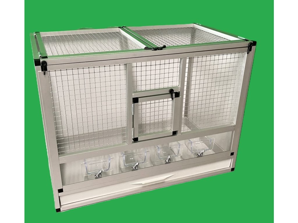 Wypełnienia ścian są wykonane z aluminiowego sandwichu, wewnętrzny kolor klatki jest biały, a zewnętrzny jest czarny. Sufit jest pokryty siatką i jest uchylny. Przednią ścianę można całkowicie wyjąć. Jest to z powodu łatwego czyszczenia, dezynfekcji klatki. Przednie karmniki można dokupić jako zamienne w naszym e-sklepie, z oznaczeniem M007 https://www.aluhobby.cz/karmnik-szuflada/