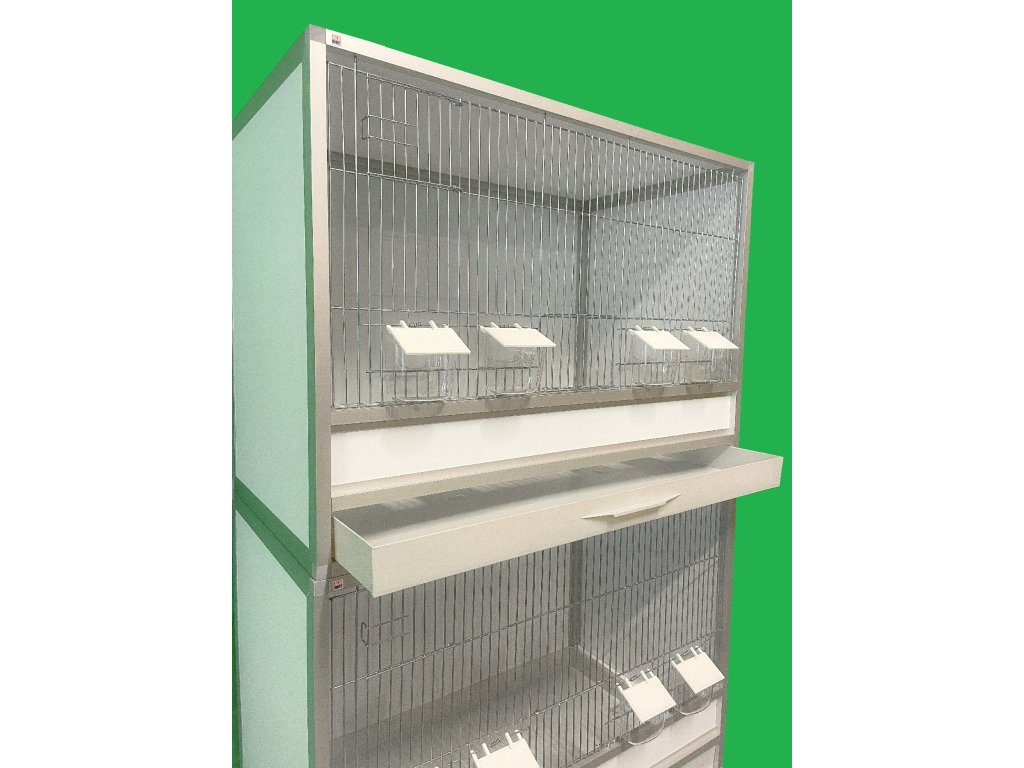 Każda klatka jest oddzielna i jest umieszczona albo bezpośrednio na podwoziu, albo na drugiej klatce, gdzie stabilność klatki utrzymuje dodatkowy profil. Wypełnienia ścian wykonane są z aluminiowego sandwichu, który jest osadzony w ramie klatki. Aluminiowy sandwich to bardzo wytrzymały, solidny materiał, który można wiercić, ciąć. Klatkę skrzyniową można wybrać w kolorze białym, srebrnym, zielonym, antracytowym, żółtym i czarnym, gdzie od wewnętrznej strony jest kolor biały. Wymiary pojedynczej klatki to w 54 x sz 72,5 x g 41 cm. Cała konstrukcja ma wymiary 205 cm wysokości, 72,5 cm szerokości i 41 cm głębokości. Te klatki skrzyniowe są bardzo wytrzymałe. Można je nie tylko myć gorącą wodą, ale można również używać różnych środków dezynfekujących. Te klatki zapewniają nie tylko zdrową hodowlę, ale także będą służyć pokoleniom.Parametry dodatkowe