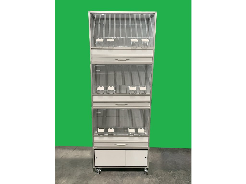 Zestaw trzech klatek skrzyniowych plus podwozie z szafką na przechowywanie.