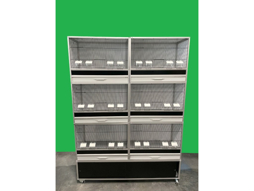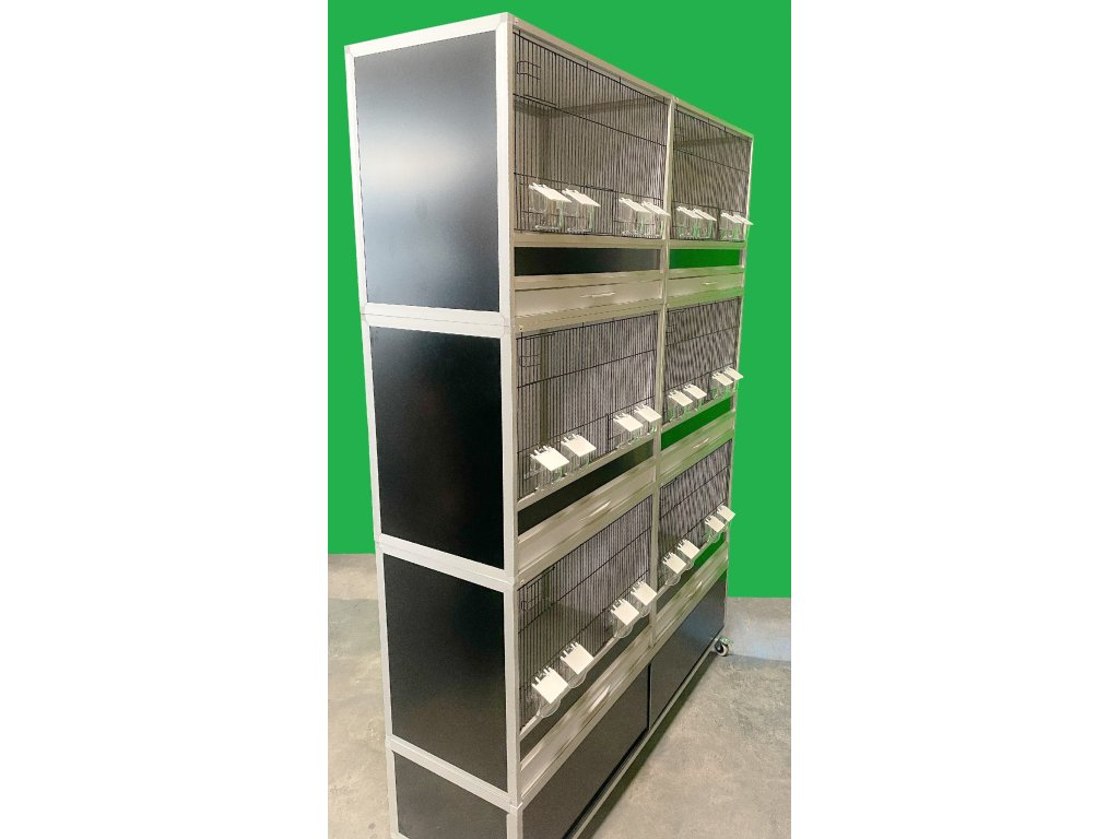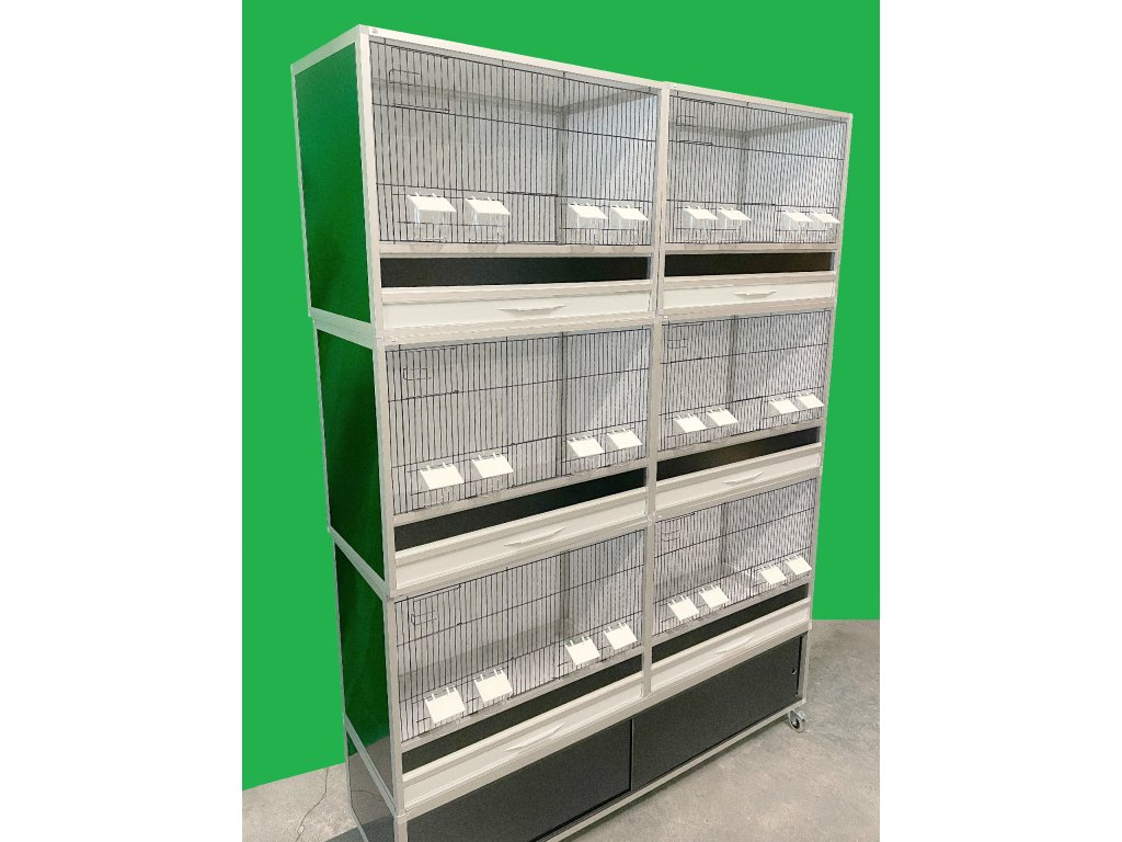 Każda klatka jest oddzielna i jest umieszczona albo bezpośrednio na podwoziu, albo na drugiej klatce, gdzie stabilność klatek utrzymuje dodatkowy profil. Wypełnienia ścian wykonane są z aluminiowego sandwichu, który jest osadzony w ramie klatki. Aluminiowy sandwich to bardzo wytrzymały, solidny materiał, który można wiercić i ciąć. Klatkę skrzyniową można wybrać w kolorze białym, srebrnym, zielonym, antracytowym, żółtym lub tak jak widać na obrazku w kolorze czarnym, gdzie wewnętrzna strona klatki jest w kolorze białym. Wymiary pojedynczej klatki to w 54 x sz 73 x g 41cm. Cała konstrukcja ma wymiary 205,5 x 145,5 x 41 cm. Te klatki skrzyniowe są bardzo wytrzymałe. Można je nie tylko myć gorącą wodą, ale można również używać różnych środków dezynfekujących. Te klatki zapewniają nie tylko zdrową hodowlę, ale także będą służyć pokoleniom.Parametry dodatkowe