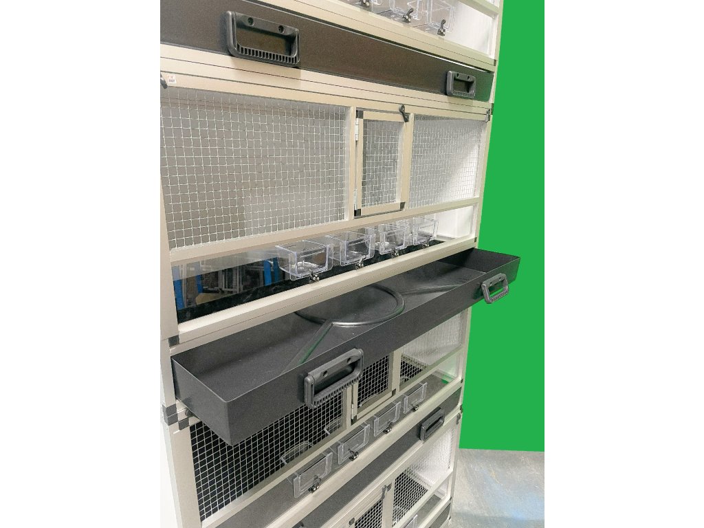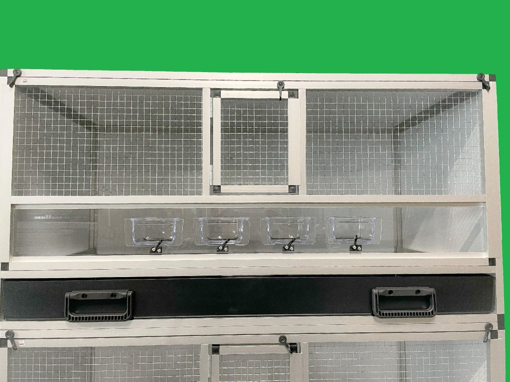Każda klatka jest oddzielna i jest umieszczona albo bezpośrednio na podwoziu, albo na drugiej klatce, gdzie stabilność klatki utrzymuje dodatkowy profil. Wypełnienia ścian wykonane są z aluminiowego sandwichu, który jest osadzony w ramie klatki. Aluminiowy sandwich to bardzo wytrzymały i solidny materiał, który można wiercić i ciąć. Klatkę skrzyniową można wybrać w kolorze białym, srebrnym, zielonym, antracytowym, żółtym i czarnym, gdzie wewnętrzna strona klatki jest w kolorze białym. Wymiary pojedynczej klatki to wys. 50 x szer. 100 x gł. 50 cm. Cała konstrukcja ma wymiary 217 x 100 x 50 cm. Te klatki skrzyniowe są bardzo wytrzymałe. Można je nie tylko myć gorącą wodą, ale można również używać różnych środków dezynfekujących. Te klatki zapewniają nie tylko zdrową hodowlę, ale także będą służyć pokoleniom.Parametry dodatkowe