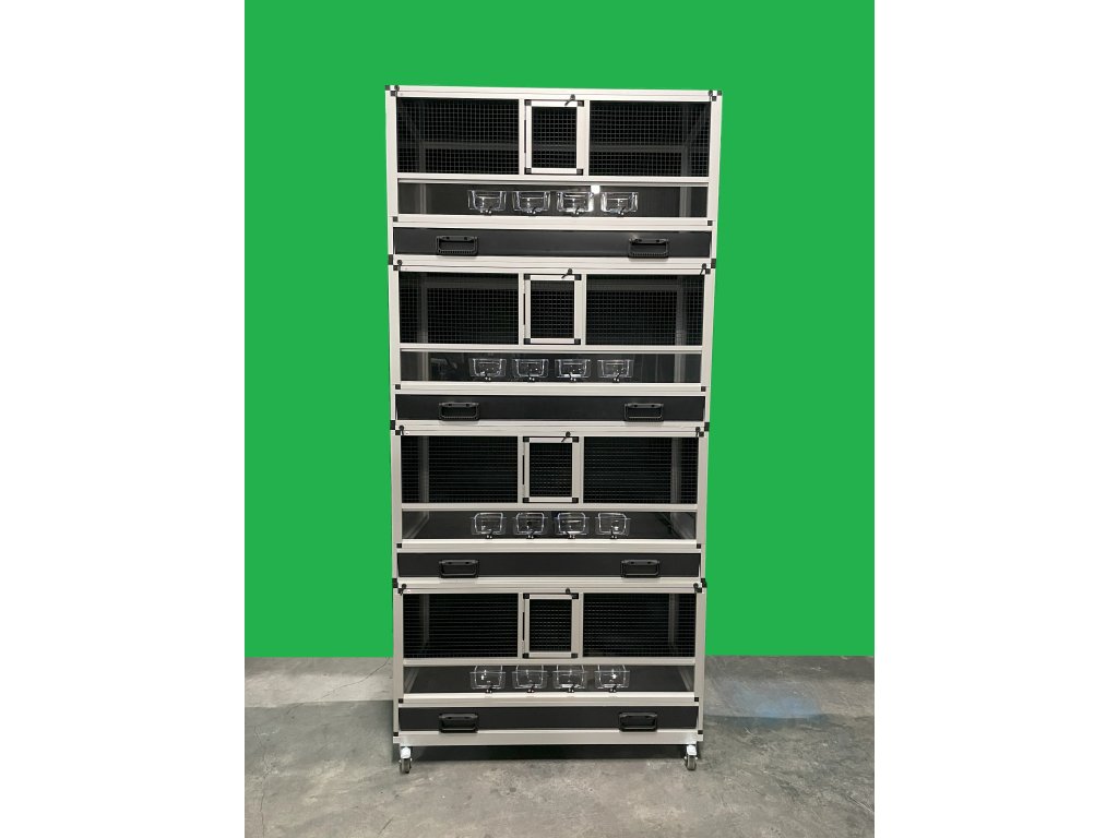 Każda klatka jest oddzielna i jest umieszczona albo bezpośrednio na podwoziu, albo na drugiej klatce, gdzie stabilność klatki utrzymuje dodatkowy profil. Wypełnienia ścian wykonane są z aluminiowego sandwichu, który jest osadzony w ramie klatki. Aluminiowy sandwich to bardzo wytrzymały i solidny materiał, który można wiercić i ciąć. Klatkę skrzyniową można wybrać w kolorze białym, srebrnym, zielonym, antracytowym, żółtym i czarnym, gdzie wewnętrzna strona klatki jest w kolorze białym. Wymiary pojedynczej klatki to 50 cm wysokości, 100 cm szerokości i 50 cm głębokości. Cała konstrukcja ma wymiary 217 x 100 x 50 cm. Te klatki skrzyniowe są bardzo wytrzymałe. Można je nie tylko myć gorącą wodą, ale można również używać różnych środków dezynfekujących. Te klatki zapewniają nie tylko zdrową hodowlę, ale także będą służyć pokoleniom.Parametry dodatkowe