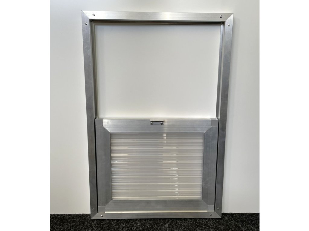 Okno wlotowe jest wykonane z profili aluminiowych. Prowadnica okna jest podłożona plastikowym materiałem dla lepszego przesuwu. Siła poliwęglanu 16mm.