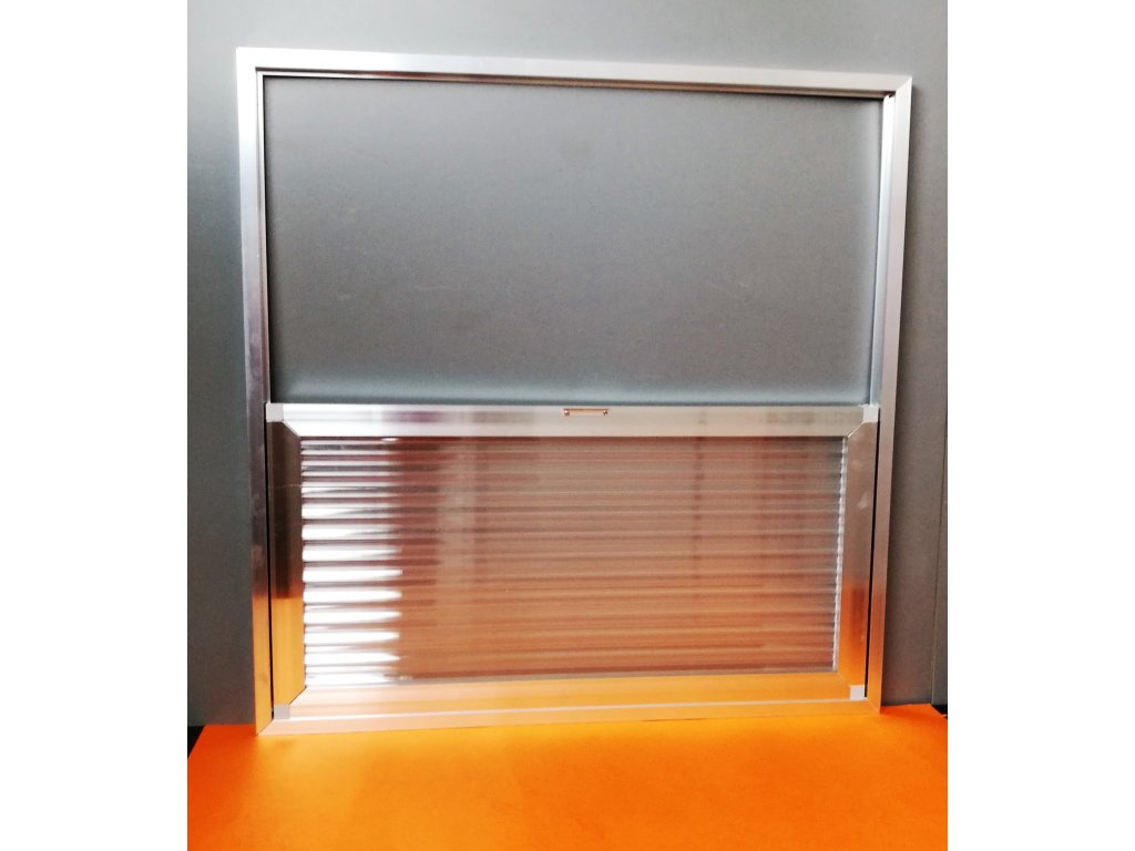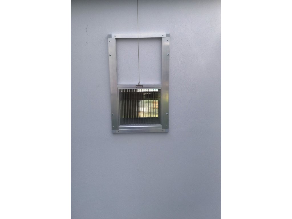 Wymiary wysokość 86cm szerokość 85cm to wymiary obwodowe zewnętrznej ramy. Okno wlotowe jest wykonane z profili aluminiowych. Prowadnica okna jest podłożona plastikowym materiałem dla lepszego przesuwu. Siła poliwęglanu 16mm.