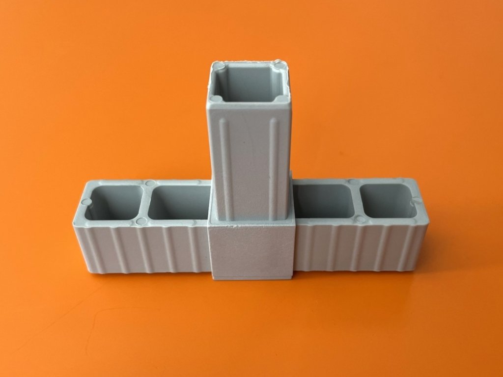 Dużą zaletą jest to, że nie ma potrzeby trudnego spawania profili aluminiowych. Połączenie profili aluminiowych charakteryzuje się wysoką wytrzymałością i zwartym wyglądem.Plastikowe złączki oferujemy w dwóch kolorach, szarym i czarnym.