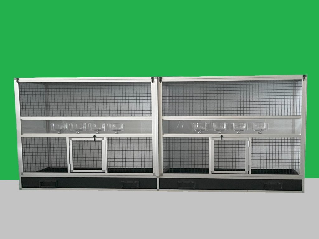 Po wyjęciu łącznika powstanie klatka do lutowania o wymiarach: szerokość 198 cm, głębokość 50 cm, wysokość 78,5 cm. Przednie ściany można wyjąć z każdej klatki osobno. Jest to z powodów łatwej konserwacji klatki. Do zawieszenia budki w klatce, jeśli jest większa niż same drzwiczki. Ściany tej klatki skrzyniowej są wykonane z bardzo wysokiej jakości materiałów, które nazywamy aluminiową kanapką. Te wypełnienia mogą być w kolorze białym, srebrnym, antracytowym, czarnym, zielonym lub żółtym. W ten materiał można ciąć, wiercić. Przednie ściany oferujemy tylko z włoskimi siatkami, w kolorze czarnym matowym oczko 19x19 drut 1,5mm i srebrnym oczko 16x16x1,2 mm. Na życzenie klienta możemy wyprodukować klatkę skrzyniową, w której sufit również będzie pokryty siatką. Jeśli klient zamówi więcej niż cztery klatki jednocześnie, dostawa tych klatek jest bezpłatna. Jeśli klient przyjedzie osobiście, otrzyma 8% rabatu na cztery lub więcej klatek w tym wykonaniu.Te klatki wyróżniają się przede wszystkim dużą trwałością i umożliwiają utrzymanie w hodowli ponadstandardowej higieny.