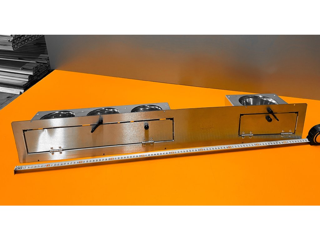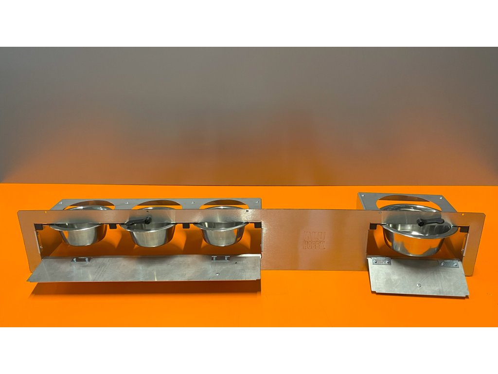 Ten stalowy blat wkłada się do już przygotowanego otworu o wymiarach 150 x 970 mm. Grubość blachy nierdzewnej użytej na płytę główną wynosi 1 mm. Dostarczamy karmnik już w stanie zmontowanym. Rama jest wykonana z blachy nierdzewnej z otworami na nit lub śrubę.
