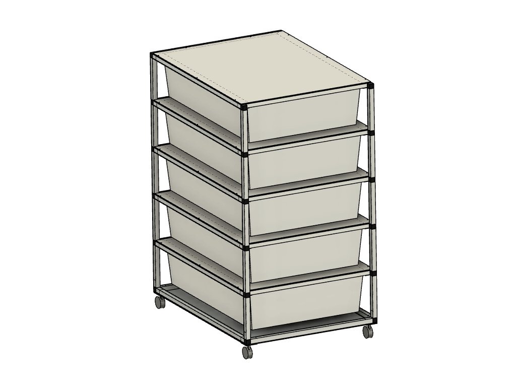 Regał jest przeznaczony na plastikowe pudełka o wymiarach szer. 56, gł. 78, wys. 18 cm. Te pudełka są również nazywane pudełkami Samla. Jeśli klient sam załatwi pudełka w sklepach Ikea, konieczne jest dokonanie drobnej modyfikacji, a mianowicie odcięcie małych wypustek po bokach, aby pudełka można było łatwo wsunąć do regału. Przegrody między piętrami są wykonane z płyt tzw. kanapki aluminiowej. Ta płyta jest bardzo odpowiednia ze względu na swoją wytrzymałość, a jednocześnie jest bardzo lekka. Kółka z gumową oponą i hamulcem umożliwiają bardzo łatwy i lekki ruch całym regałem. Kółka mogą być zastąpione aluminiowymi nóżkami. Na życzenie klienta potrafimy wyprodukować Rack na liczbę boksów zarówno na wysokość, jak i na szerokość zgodnie z wymaganiami hodowcy. Rack można również wykonać z profili z anodowaną powierzchnią, w kolorze srebrnym i czarnym. Do każdego piętra można wkładać folie grzewcze pod hodowlane boksy. Boxy są częścią Racku.