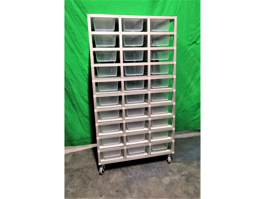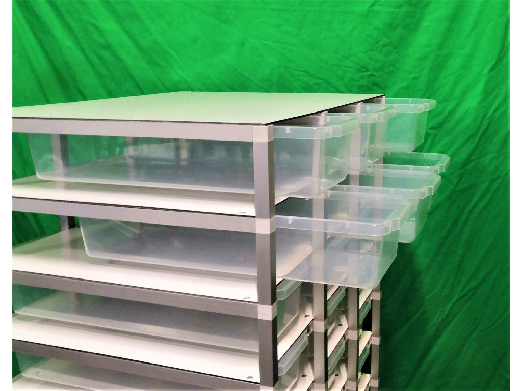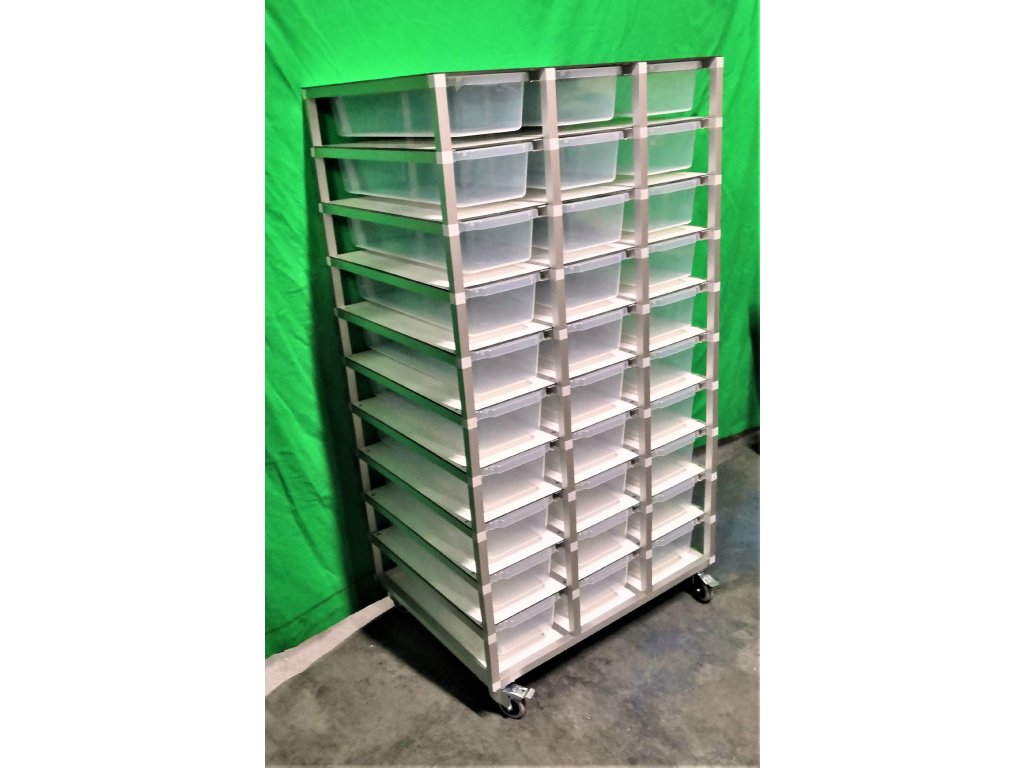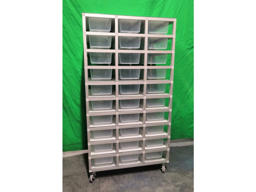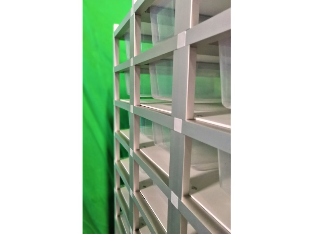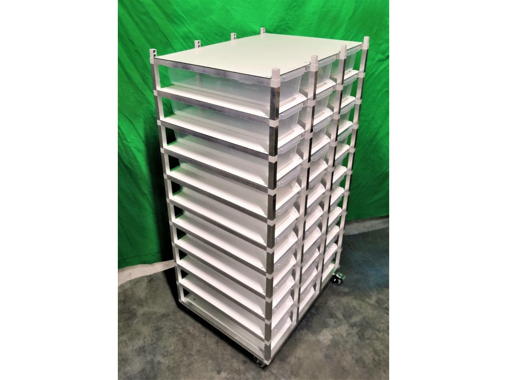 Regał jest przeznaczony na plastikowe pudełka o wymiarach szer. 19, gł. 51, wys. 10 cm. Wysokość stojaka 30 skrzynek wraz z kółkami wynosi 132 cm, szerokość 71 cm, głębokość 54,5 cm. Kółka z gumową oponą i hamulcem umożliwiają bardzo łatwy i lekki ruch całym regałem. Waga regałów wraz ze skrzyniami 41 kg Na życzenie klienta możemy wyprodukować Rack na liczbę pudeł zarówno na wysokość, jak i na szerokość zgodnie z wymaganiami hodowcy. Rack można również wykonać z profili z anodowaną powierzchnią. Do każdego piętra można wkładać folie grzewcze pod hodowlane boksy.Skrzynki są częścią Racku.Parametry dodatkowe