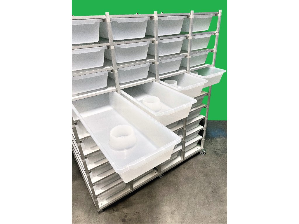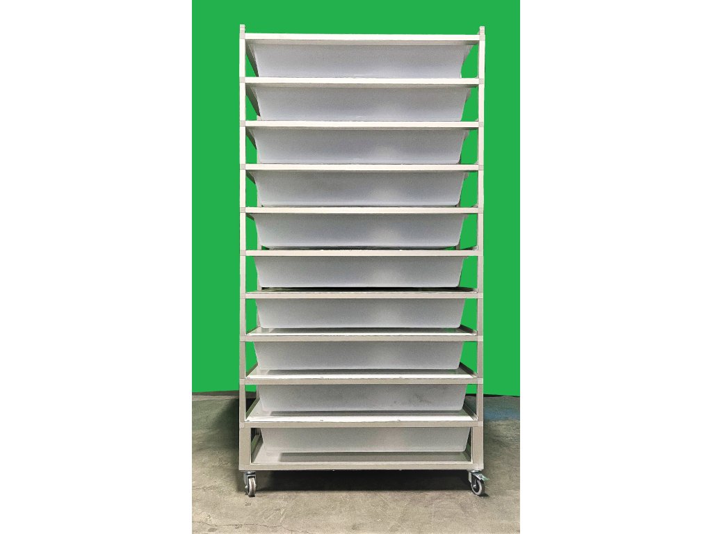 Poszczególne skrzynie są zawieszone w racku, poszczególne sufity są z aluminiowego sandwichu. To jest bardzo wytrzymały materiał. W tym materiale można wywiercić otwory o różnych średnicach do wentylacji. Kółka z gumową oponą i hamulcem umożliwiają bardzo łatwy i lekki ruch całym regałem. Na życzenie klienta potrafimy wyprodukować Rack zarówno na szerokość, jak i na wysokość oraz liczbę boksów, zgodnie z wymaganiami hodowcy.Rack jest wykonany z profili aluminiowych z anodowaną powłoką.