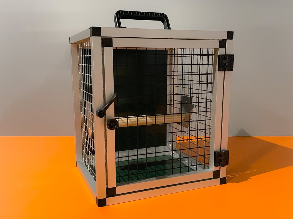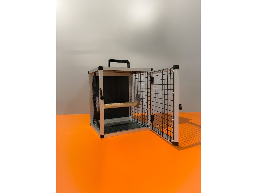 Użyte materiały są bardzo wysokiej jakości i zmywalne. Jest wykonana z profilu 15x15x1 mm z wykończeniem powierzchni anodowaniem. Wymiary klatki transportowej to szerokość 28 cm, głębokość 24 cm, wysokość 32 cm. Wypełnienia skrzynki transportowej są wykonane z aluminiowego sandwichu. Użyta siatka to włoski Esafort oczko 19x19 drut 1,45 w kolorze czarnym. Całkowita waga skrzynki 2kg.Parametry dodatkowe