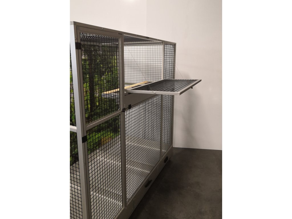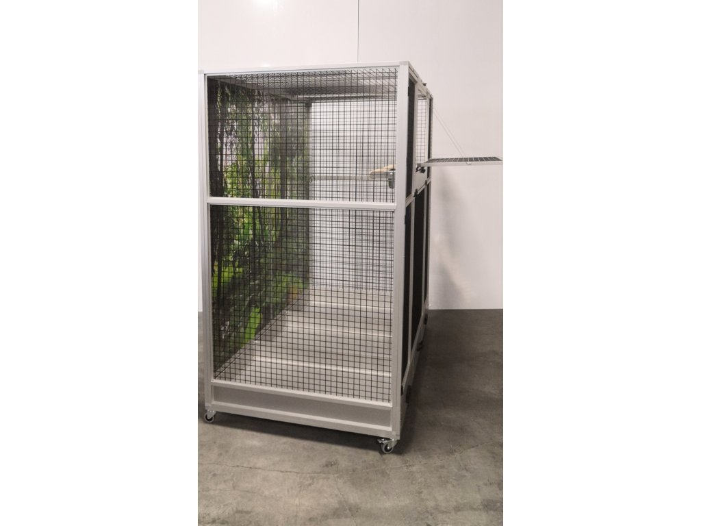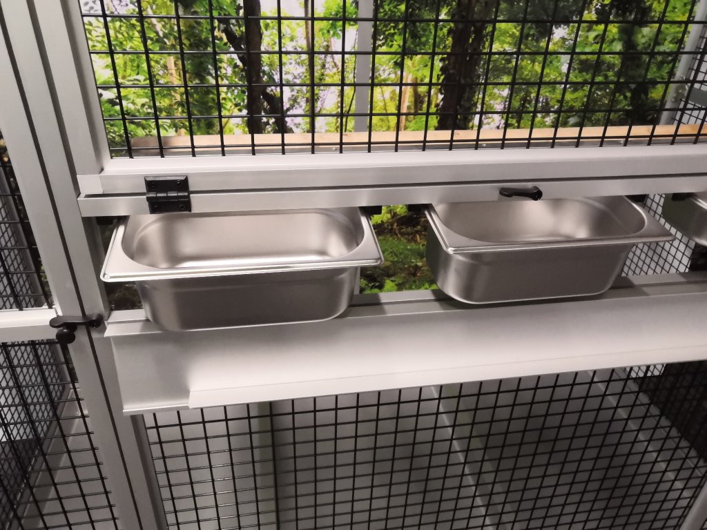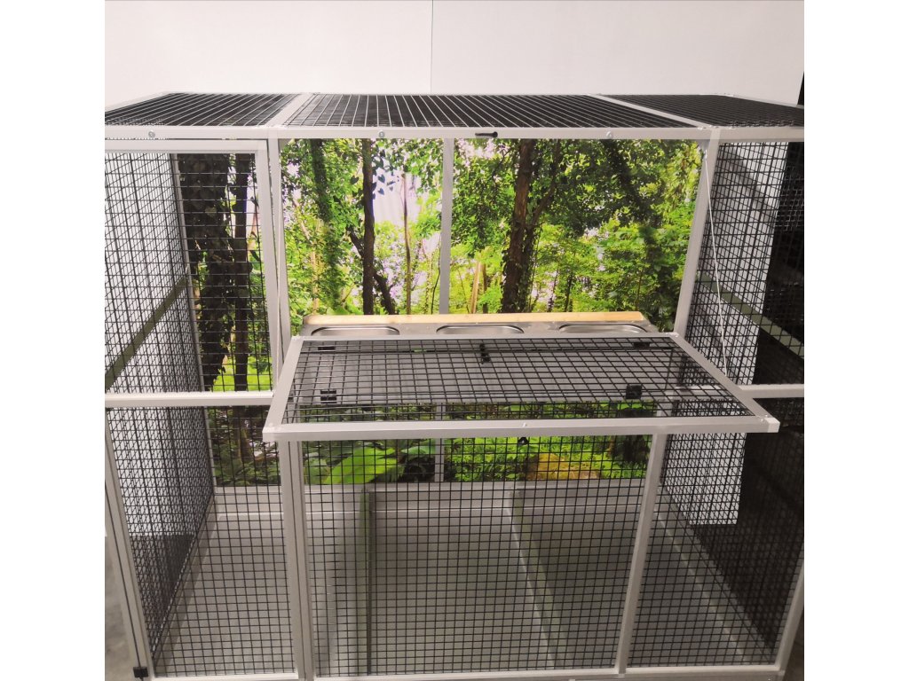 Przednia ściana jest wyposażona w stalowy stół paszowy Aluhobby KPG05 (na życzenie można zamienić na inny). Jest to stół do karmienia, gdzie używane są bardzo praktyczne i bardzo popularne pojemniki gastronomiczne. Poidła są zaprojektowane tak, aby całkowicie uniemożliwić zwierzęciu wyciągnięcie i wysypanie miski z karmą. Przednia ściana ma okno wycieczkowe.Konstrukcja woliery jest wykonana z aluminiowych profili z powłoką anodowaną. Użyte są galwanizowane sita w kolorze czarnym. Na życzenie mogą być również srebrne. . Galwanizowane sita w kolorze czarnym są naszą specjalnością. Czarny kolor cynku nie jest powszechnie używany. Widok przez te sita na zwierzę wewnątrz woliery jest naprawdę wyjątkowy. Na życzenie możemy również zaoferować tak zwane zakładki. Zasłony umożliwiają utrzymanie maksymalnej czystości w okolicy woliery.