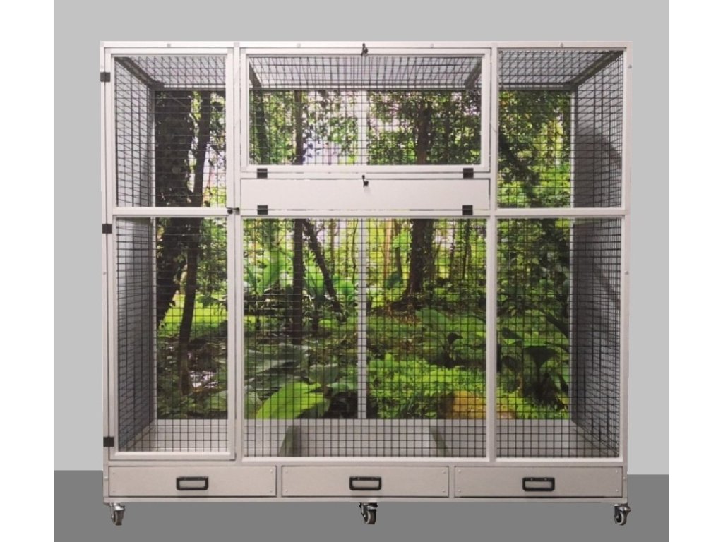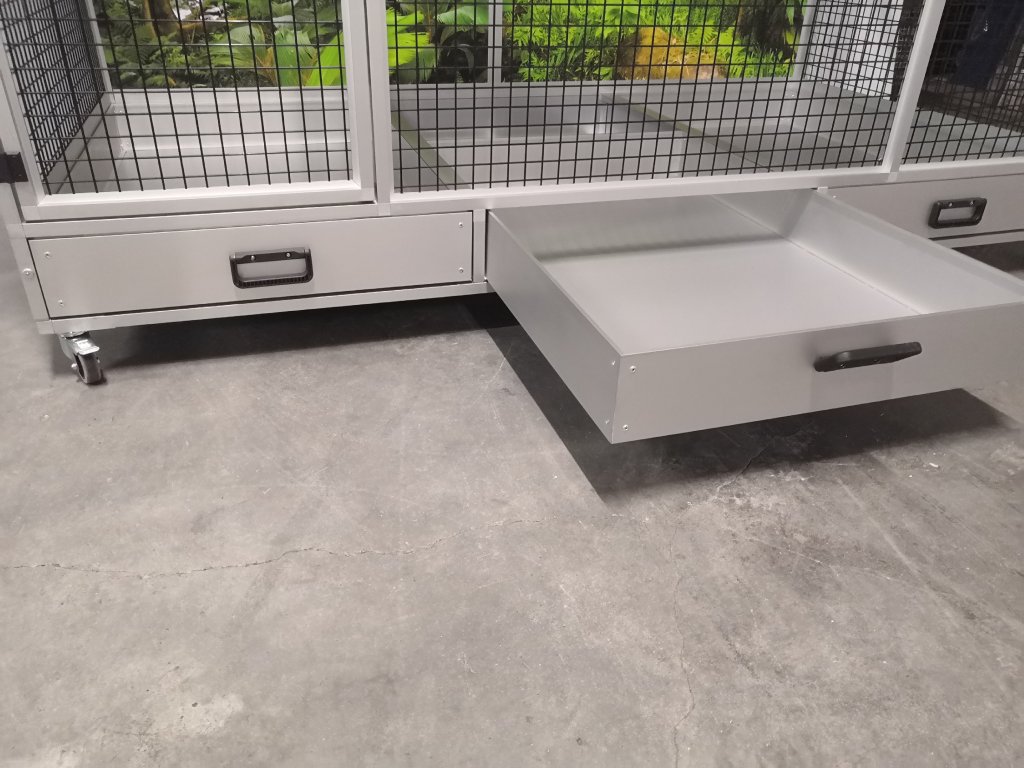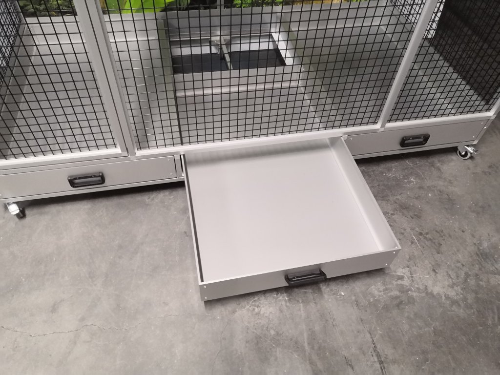Woliera jest zbudowana na samodzielnym podwoziu, które jest wyposażone w dwie aluminiowe szuflady. Szuflady mają wysokość 12 cm, co wystarczająco pozwala utrzymać bałagan tylko wewnątrz woliery. Ruszt nie jest częścią woliery, ale można go zamówić dodatkowo. Ruszt składa się z ram z profili aluminiowych, które są pokryte włoską siatką Esafort. Ten typ siatki ma bardzo wysokiej jakości wykończenie powierzchni. Łatwe czyszczenie woliery dzięki praktycznym szufladom sprawia, że ruszt nie musi już pełnić funkcji, do której byliśmy wcześniej przyzwyczajeni. Dlatego klienci rzadko wymagają rusztu.