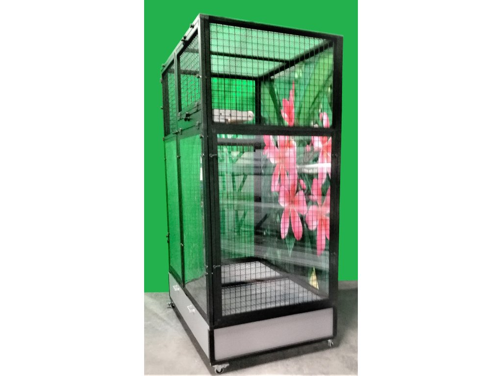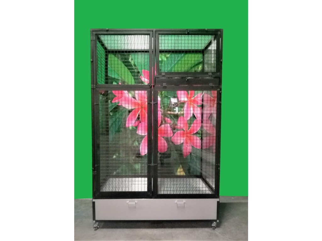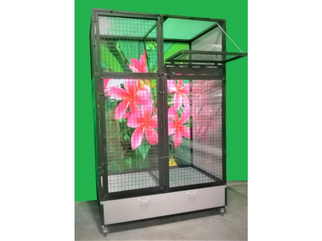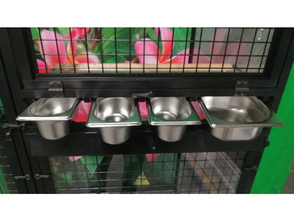 Jest to stół do karmienia, gdzie używane są bardzo praktyczne i bardzo popularne pojemniki gastronomiczne. Poidła są zaprojektowane tak, aby uniemożliwić zwierzęciu wyciągnięcie i wysypanie miski z karmą.Konstrukcja woliery jest wykonana z aluminiowych profili z powłoką czarny anod. W tej wolierze w ramy wstawiono siatkę z ocynkiem galwanicznym w czarnym kolorze. Galwanizowane sita w kolorze czarnym są naszą specjalnością. Widok przez te sita na zwierzę wewnątrz woliery jest naprawdę wyjątkowy. Woliera mieszkaniowa nadaje się do nowoczesnych wnętrz, a ponieważ jest wyposażona w kółka, można ją łatwo przenieść na taras domu lub mieszkania.