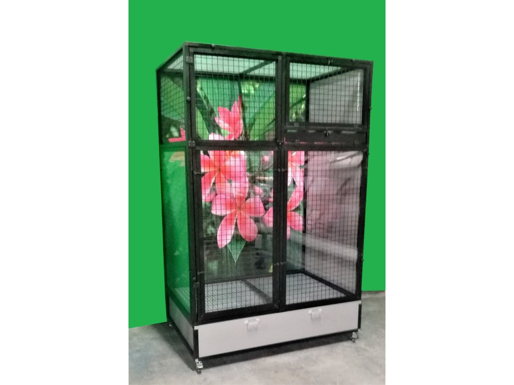 Klatka jest rozkładana – składana, co umożliwia postawienie woliery nawet tam, gdzie wcześniej można było umieścić tylko klatkę. Składa się z podwozia, przedniej i tylnej ściany, dwóch bocznych ścian i sufitu. Tylna ściana może być za dodatkową opłatą pokryta tapetą według wyboru z pięciu oferowanych wariantów. Tapeta jest laminowana i tym samym chroniona przed ścieraniem. Woliera jest zbudowana na osobnym podwoziu, które jest wyposażone w dwie plastikowe tacki. Dwoma dla lepszej manipulacji podczas sprzątania woliery. Wanienki mają głębokość 18 cm, co wystarczająco umożliwia utrzymanie porządku wokół woliery.
