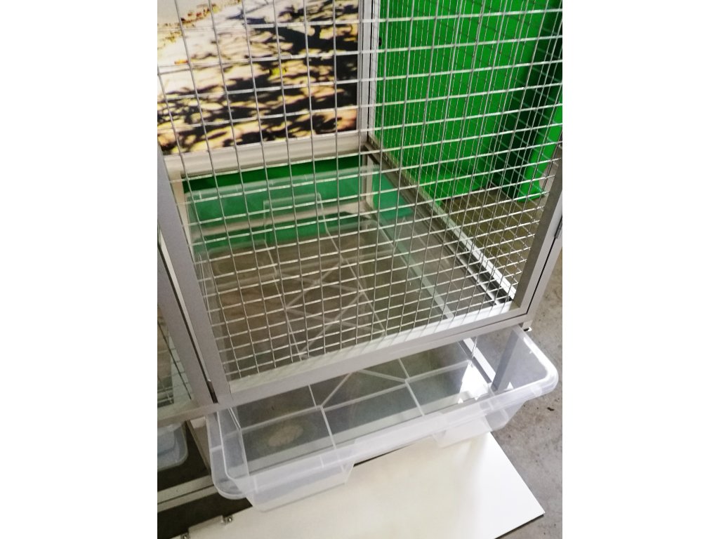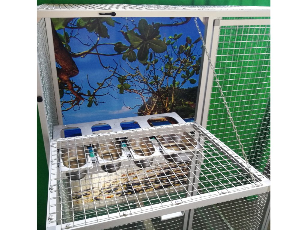 Jest to stół do karmienia, gdzie używane są bardzo praktyczne i bardzo popularne pojemniki gastronomiczne. Poidła są zaprojektowane tak, aby uniemożliwić zwierzęciu wyciągnięcie i wysypanie miski z karmą.Konstrukcja woliery jest wykonana z aluminiowych profili z powłoką Elox. Użyto bardzo wysokiej jakości sprawdzonej siatki marki Esafort.Bytowa woliera jest odpowiednia do nowoczesnych wnętrz, a ponieważ jest wyposażona w kółka, można ją łatwo przenieść na taras domu lub mieszkania.