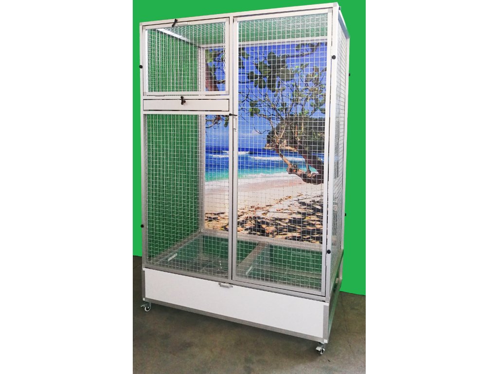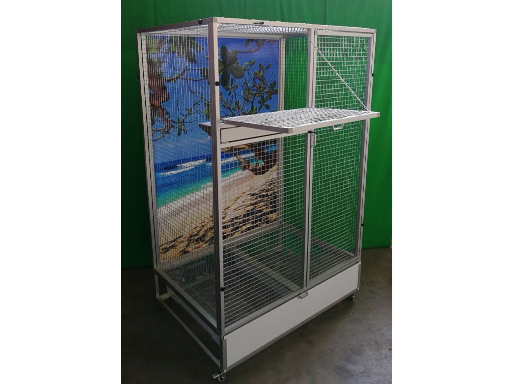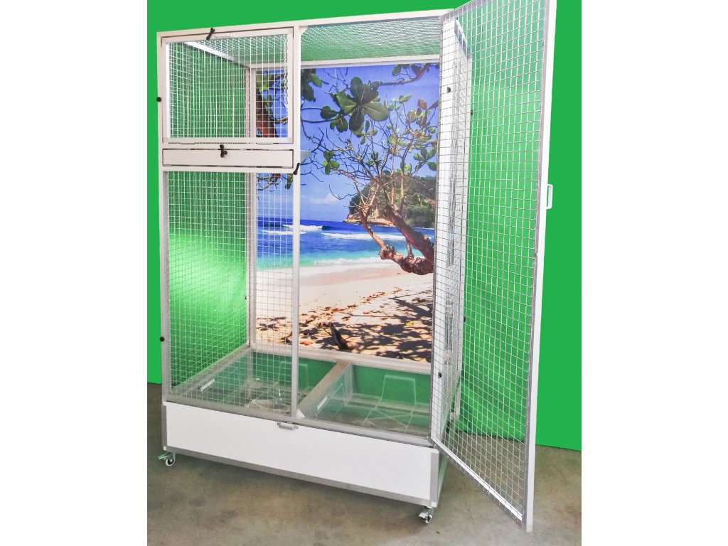 Wymiary szerokość 116 cm, głębokość 80 cm, wysokość 184 cm. Klatka jest rozkładana – składana, co umożliwia postawienie woliery nawet tam, gdzie wcześniej można było umieścić tylko klatkę. Składa się z podwozia, przedniej i tylnej ściany, dwóch bocznych ścian i sufitu. Tylna ściana może być za dodatkową opłatą pokryta tapetą według wyboru z pięciu oferowanych wariantów. Tapeta jest laminowana i tym samym chroniona przed ścieraniem. Woliera jest zbudowana na osobnym podwoziu, które jest wyposażone w dwie plastikowe tacki. Dwoma dla lepszej manipulacji podczas sprzątania woliery. Wanienki mają głębokość 18 cm, co wystarczająco umożliwia utrzymanie porządku wokół woliery.