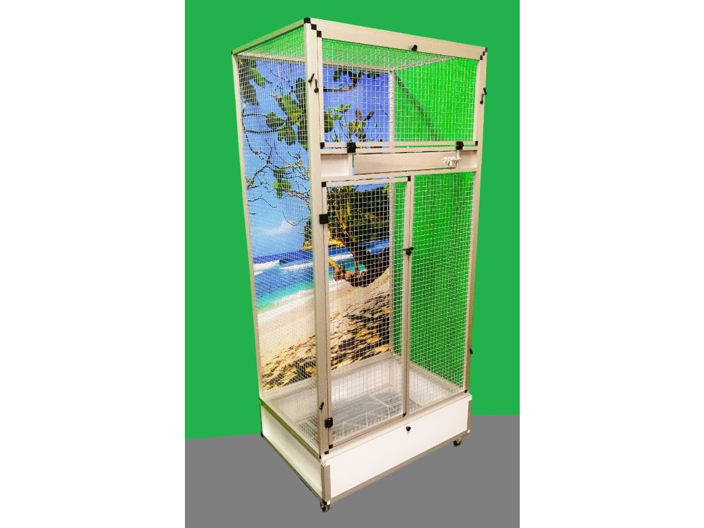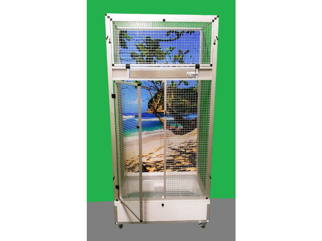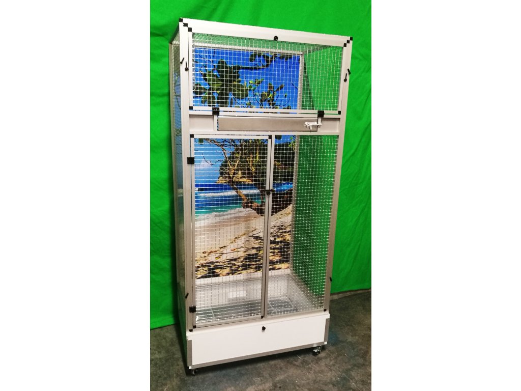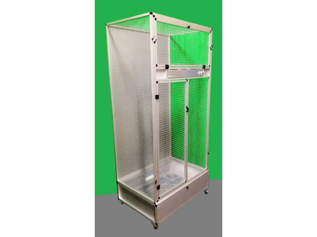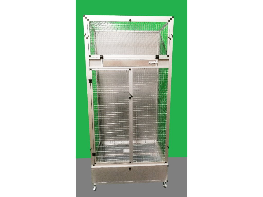 Klatka jest umieszczona na oddzielnym podwoziu, które jest wyposażone w plastikową wanienkę, z którą bardzo dobrze się manipuluje podczas czyszczenia klatki. Wanienka ma głębokość 18 cm, co wystarczająco umożliwia utrzymanie porządku wokół woliery. Przednia ściana jest wyposażona w obrotowy stół do karmienia z trzema miskami o pojemności 0,35 l. Na naszej stronie ma oznaczenie KPM03. Konstrukcja klatki jest wykonana z aluminiowych profili z powłoką anodowaną. Użyto bardzo wysokiej jakości sprawdzonej siatki marki Esafort 16x16x1,20 mm. Na życzenie można wyposażyć klatkę w ruszt nad wanienką. Klatka mieszkaniowa nadaje się do nowoczesnych wnętrz. Jest wyposażona w kółka, łatwo można ją przenieść na taras domu lub mieszkania.