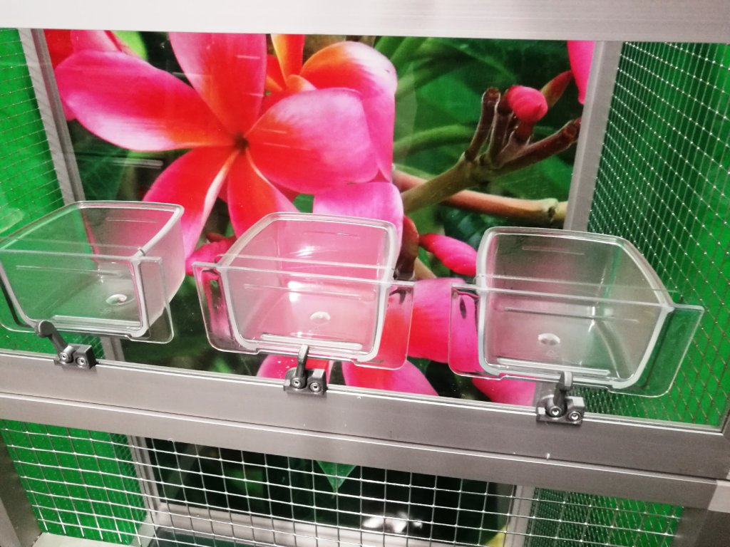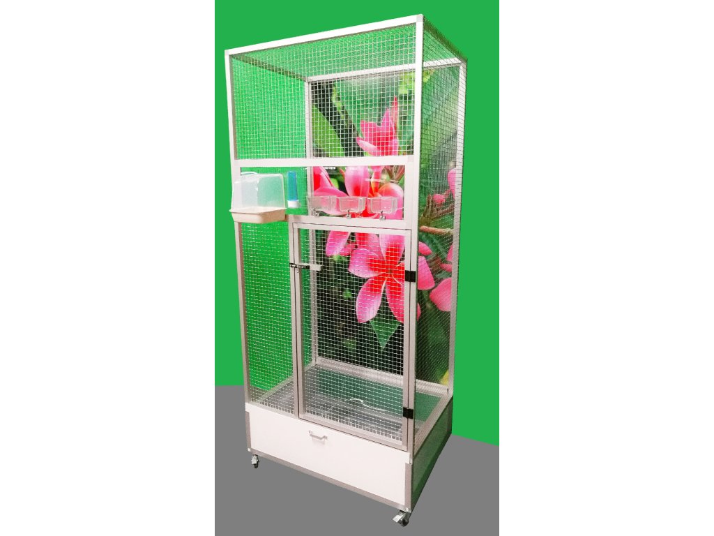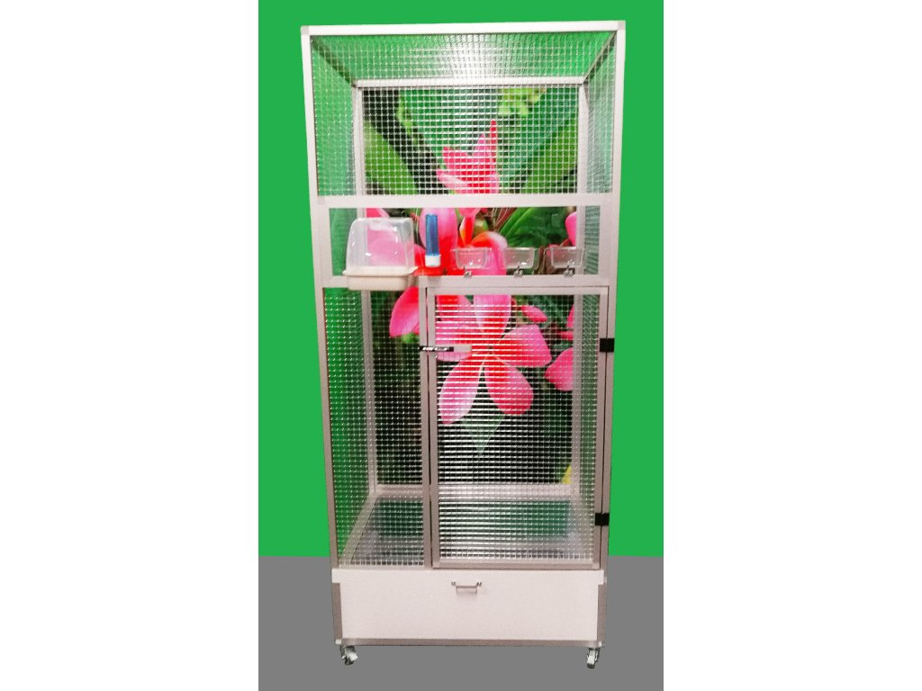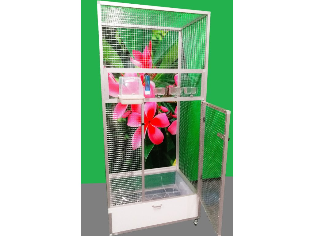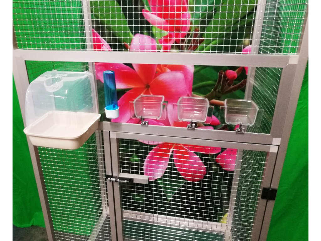 Klatka jest umieszczona na oddzielnym podwoziu, które jest wyposażone w plastikową wanienkę, którą bardzo łatwo się manipuluje podczas czyszczenia klatki. Wanienka ma głębokość 18 cm, co wystarczająco umożliwia utrzymanie porządku wokół woliery. Przednia ściana jest wyposażona w plastikową łazienkę od włoskiego producenta, trzy wsuwane karmniki M007 i poidło. Karmniki są zabezpieczone obrotami aluhobby z blokadą. Karmniki są zaprojektowane tak, aby uniemożliwić zwierzęciu wyciągnięcie i wysypanie miski z karmą. Konstrukcja klatki jest wykonana z profili aluminiowych z powłoką elox. Użyto bardzo wysokiej jakości sprawdzonej siatki marki Esafort 16x16x1,20 mm. Na życzenie można wyposażyć klatkę w ruszt nad wanienką. Mieszkanie w klatce jest odpowiednie do nowoczesnych wnętrz. Klatka jest wyposażona w kółka, łatwo można ją przenieść na taras domu lub mieszkania.