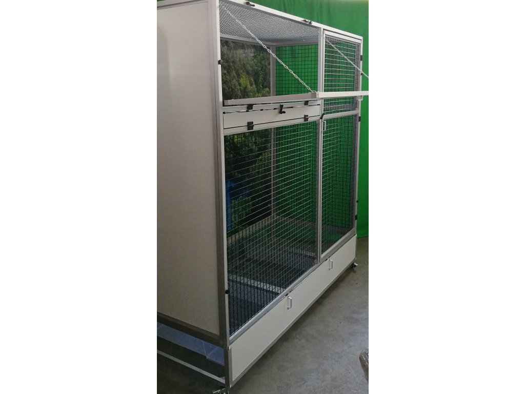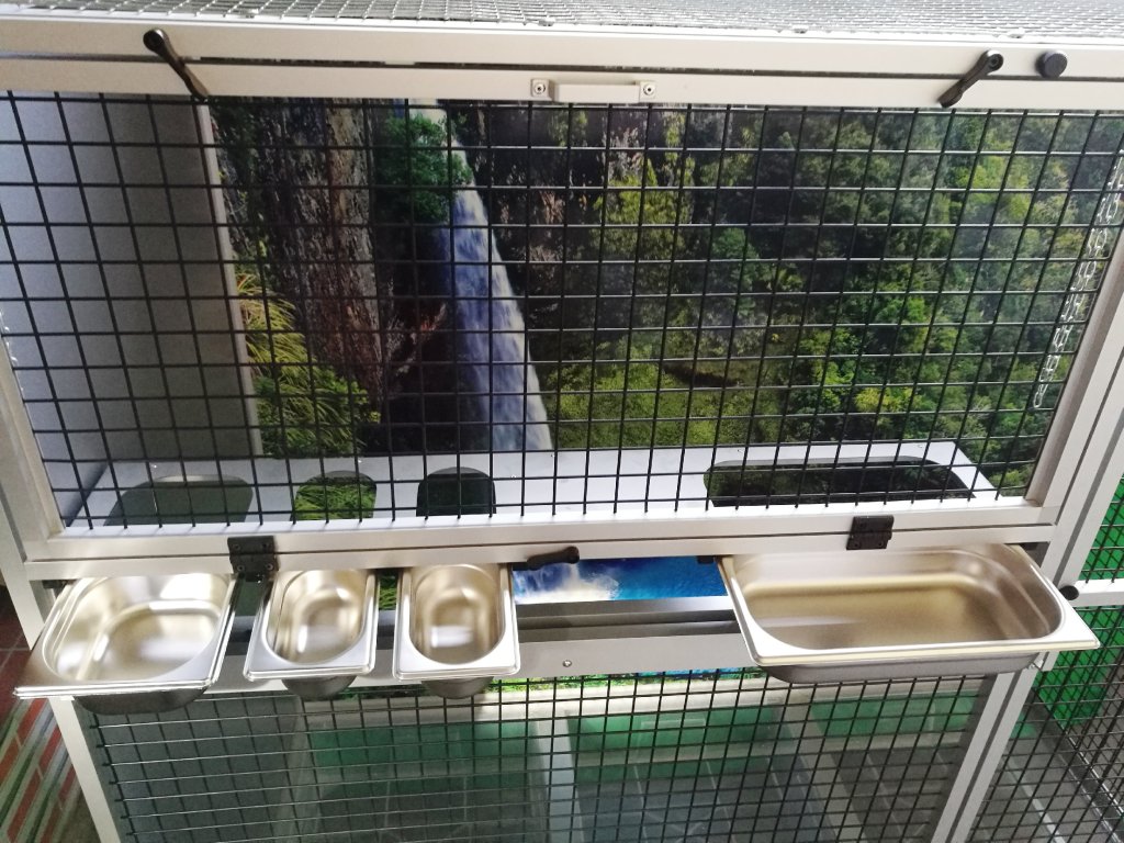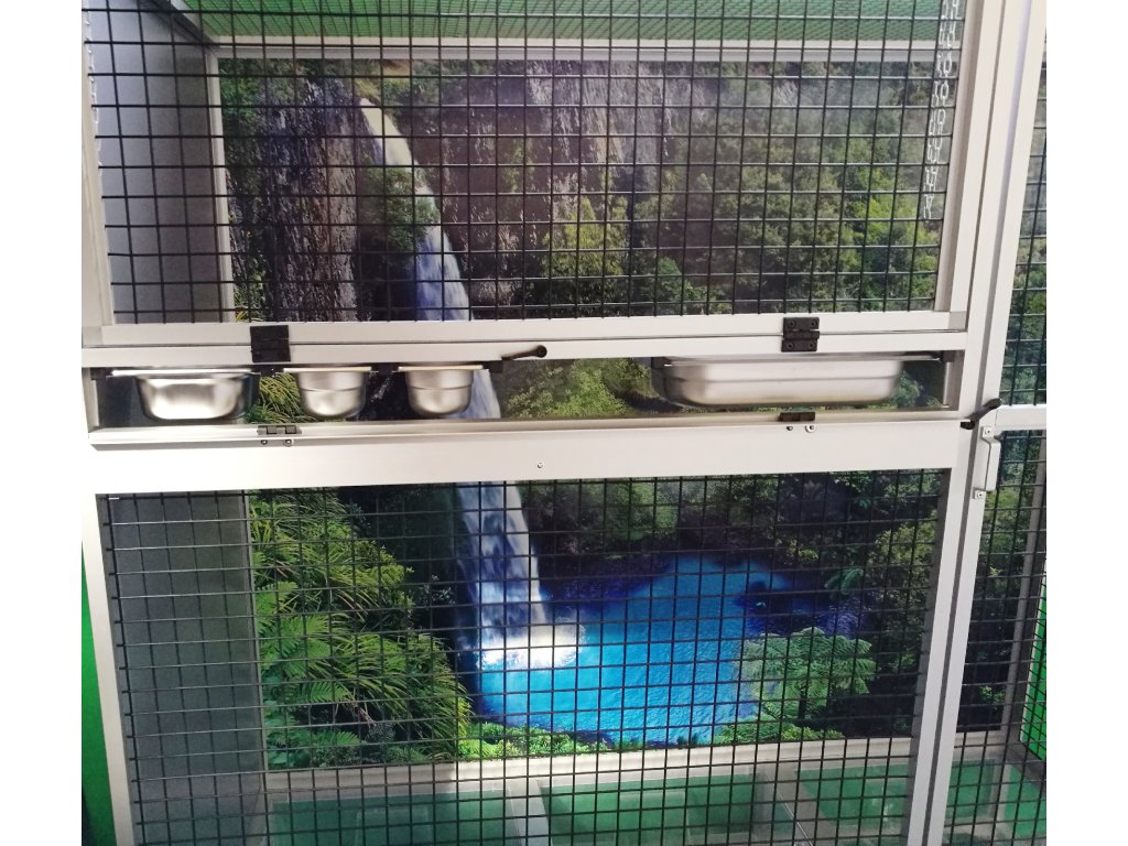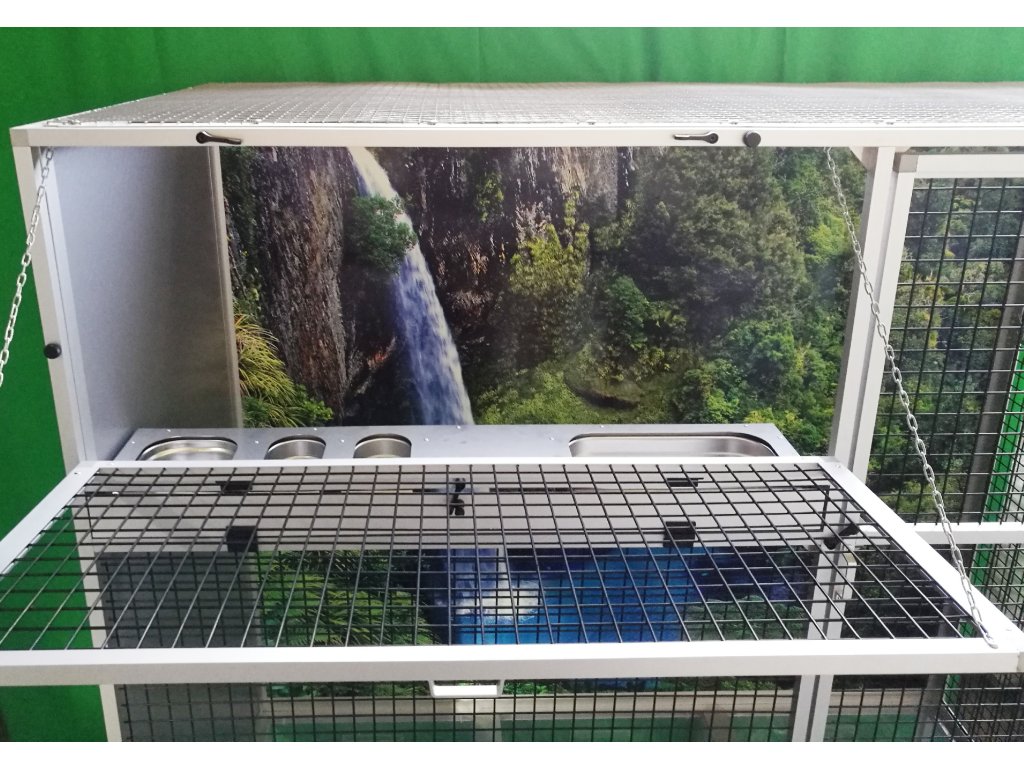 Ruszt nie jest częścią woliery, ale można go zamówić dodatkowo. Ruszt składa się z ram z profili aluminiowych, które są pokryte włoską siatką Esafort. Ten typ siatki ma bardzo wysokiej jakości wykończenie powierzchni. Łatwe czyszczenie woliery dzięki praktycznym tackom sprawia, że ruszt już nie musi pełnić funkcji, do której byliśmy wcześniej przyzwyczajeni. Dlatego klienci rzadko wymagają rusztu.Przednia ściana jest wyposażona w stalowy stół paszowy Aluhobby KPG05. Jest to stół do karmienia, gdzie używane są bardzo praktyczne i bardzo popularne pojemniki gastronomiczne. Poidła są zaprojektowane tak, aby całkowicie uniemożliwić zwierzęciu wyciągnięcie i wysypanie miski z karmą.Konstrukcja woliery jest wykonana z aluminiowych profili z powłoką elox. Mogą być również używane ocynkowane galwanicznie sita lub siatki marki Esafort. Przy wolierze na podanych zdjęciach użyto cynku galwanicznego w czarnym kolorze. Galwanizowane sita w kolorze czarnym są naszą specjalnością. Czarny kolor cynku nie jest powszechnie używany. Widok przez te sita na zwierzę wewnątrz woliery jest naprawdę wyjątkowy.