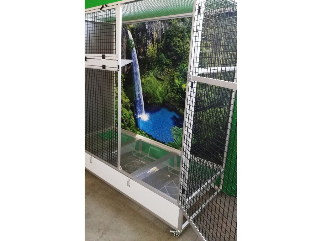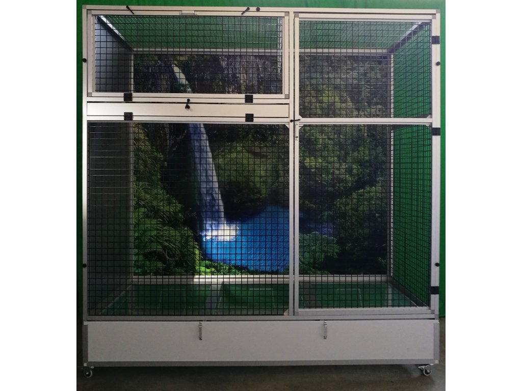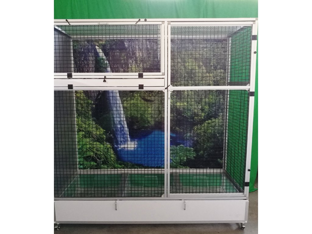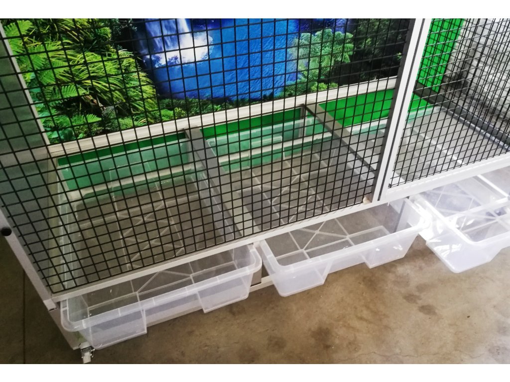 Klatka jest rozkładana – składana, co umożliwia postawienie woliery nawet tam, gdzie wcześniej można było umieścić tylko klatkę. Składa się z podwozia, przedniej i tylnej ściany, dwóch bocznych ścian i sufitu. Tylna ściana może być za dodatkową opłatą pokryta tapetą według wyboru z pięciu oferowanych wariantów. Tapeta jest laminowana i tym samym chroniona przed ścieraniem. Woliera jest zbudowana na osobnym podwoziu, które jest wyposażone w trzy plastikowe wanienki. Trzema, dla lepszej manipulacji podczas sprzątania woliery. Wanienki mają głębokość 18 cm, co wystarczająco pozwala utrzymać bałagan tylko wewnątrz woliery.