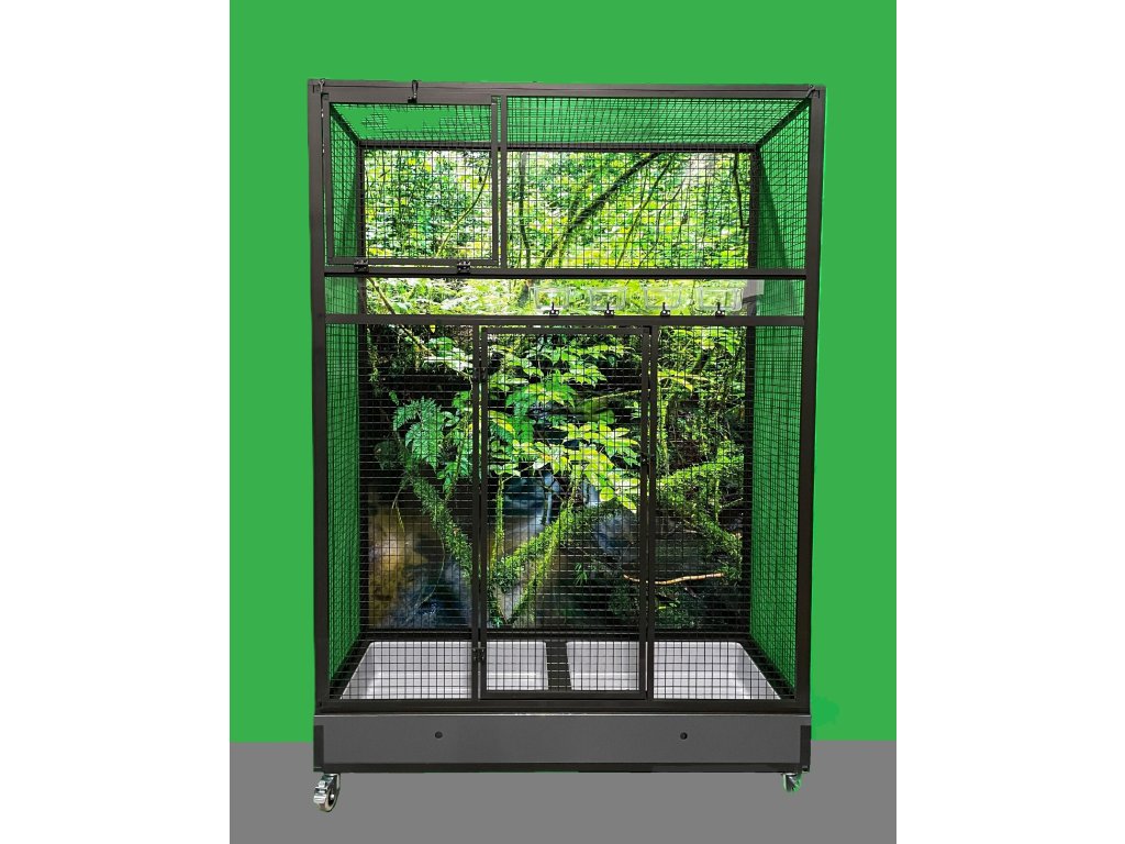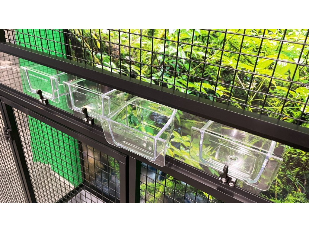 Manipulacja wanienkami podczas czyszczenia klatki jest bardzo łatwa. Wanienka ma głębokość 18 cm, co pozwala utrzymać porządek wokół woliery. Przednia ściana jest wyposażona w pięć przezroczystych wsuwanych karmników. Konstrukcja klatki jest wykonana z aluminiowych profili z powierzchniowym wykończeniem anodowaniem na czarny mat. Użyto jest bardzo wysokiej jakości siatki marki Esafort o oczku 19x19, drut 1,5 mm. Siatka jest pomalowana na czarny matowy kolor, co umożliwia lepszy widok na hodowane zwierzę.