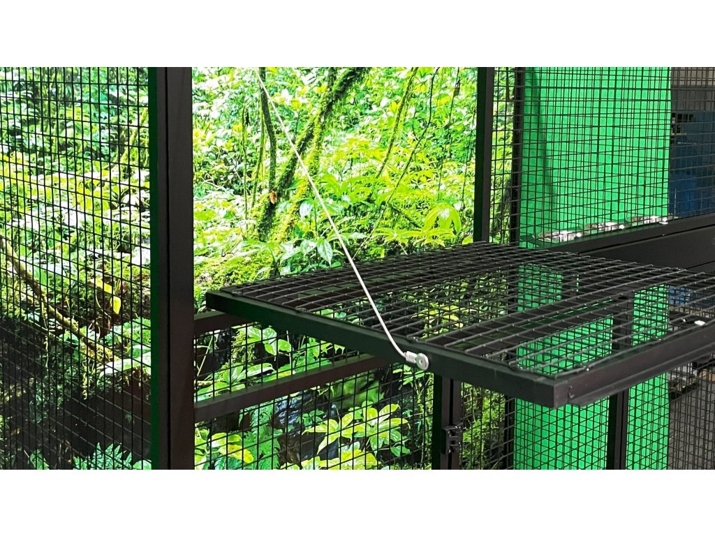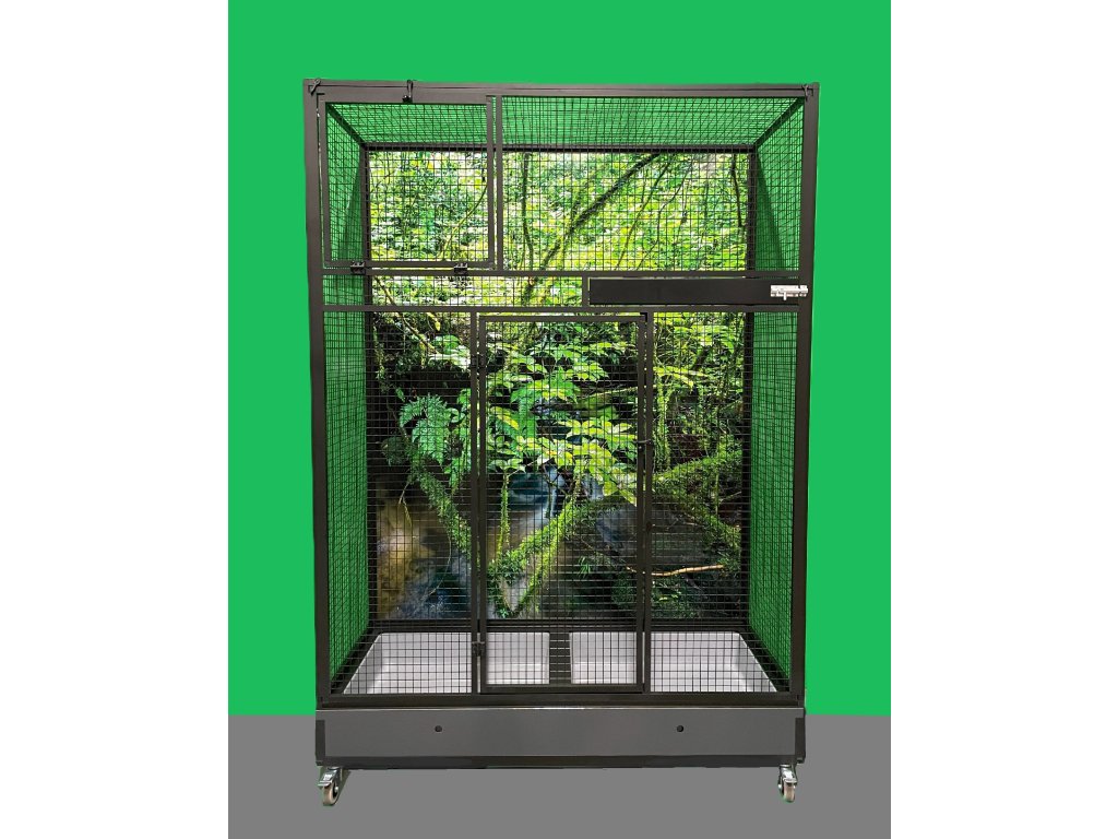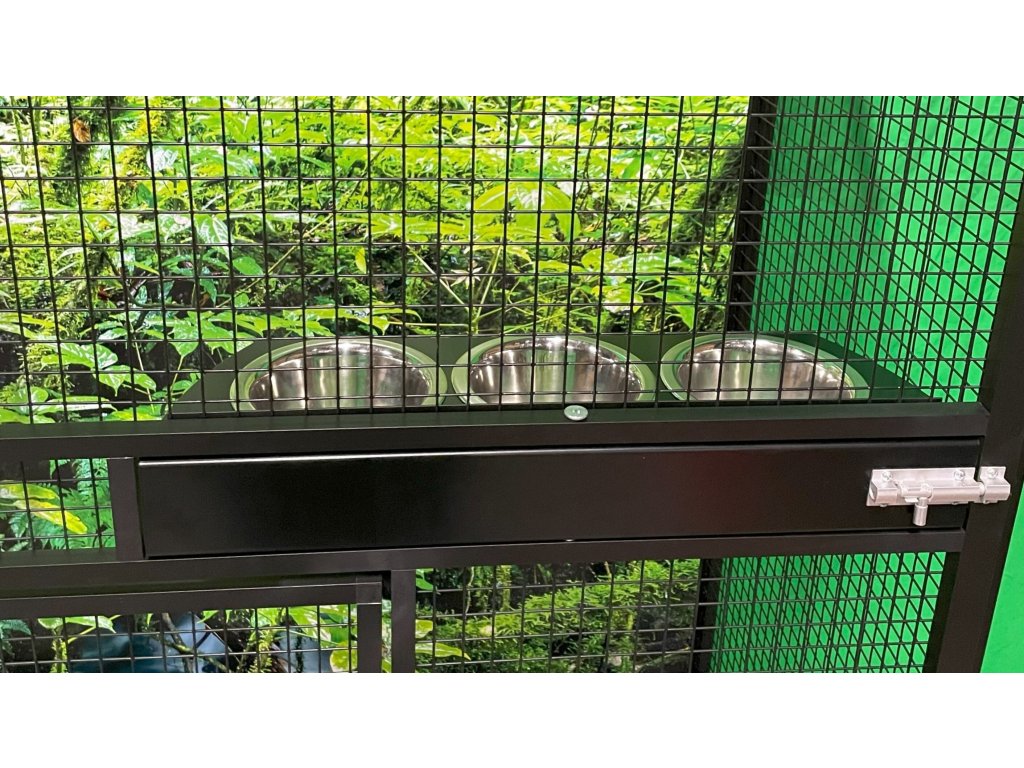 Manipulacja wanienkami podczas czyszczenia klatki jest bardzo łatwa. Wanienka ma głębokość 18 cm, co pozwala utrzymać porządek wokół woliery. Przednia ściana jest wyposażona w obrotowy stół do karmienia z trzema miskami o pojemności 0,35 l. Konstrukcja klatki jest wykonana z profili aluminiowych z wykończeniem powierzchniowym, anodowaniem. Użyto jest bardzo wysokiej jakości, sprawdzone siatki marki Esafort 16x16x1,20 mm.