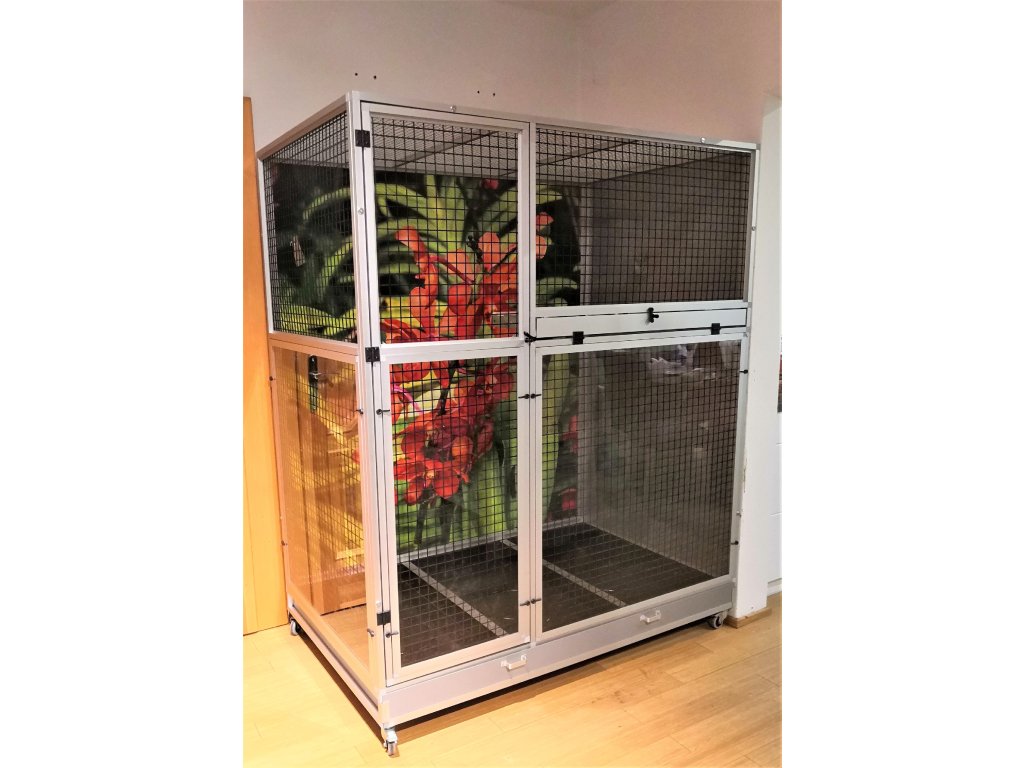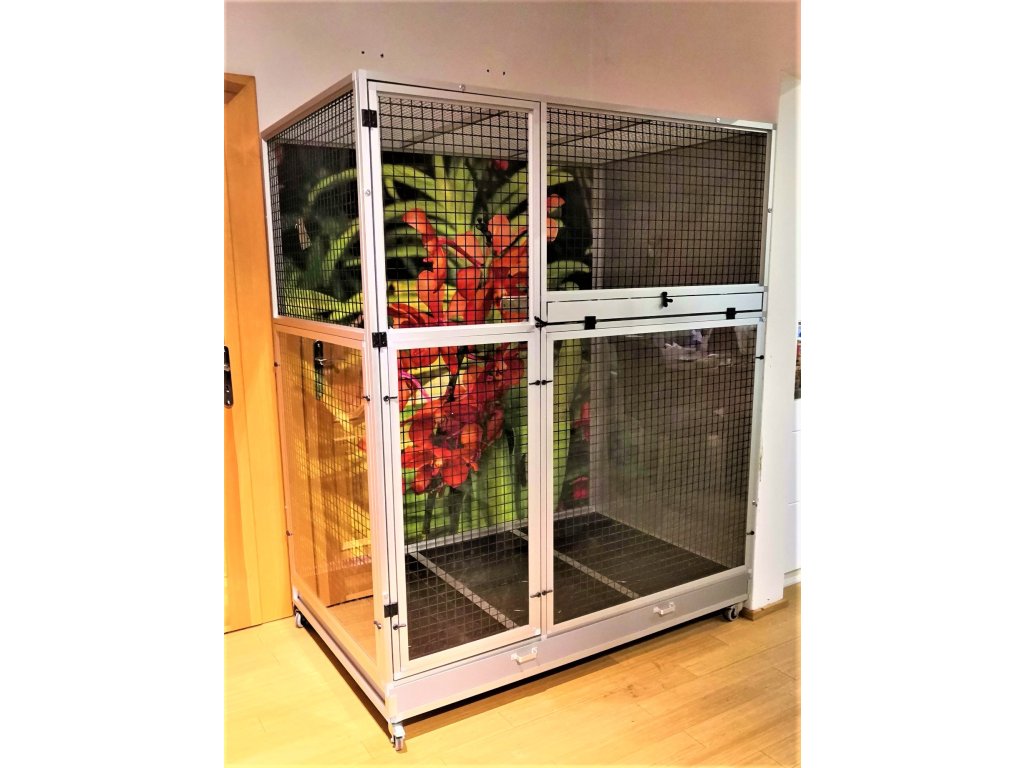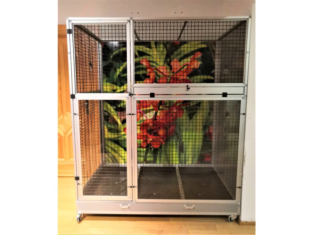 Woliera jest zbudowana na samodzielnym podwoziu, które jest wyposażone w dwie aluminiowe szuflady. Szuflady mają wysokość 12 cm, co wystarczająco pozwala utrzymać bałagan tylko wewnątrz woliery. Ruszt nie jest częścią woliery, ale można go zamówić dodatkowo. Ruszt składa się z ram z profili aluminiowych, które są pokryte włoską siatką Esafort. Ten typ siatki ma bardzo wysokiej jakości wykończenie powierzchni. Łatwe czyszczenie woliery dzięki praktycznym szufladom sprawia, że ruszt nie musi już pełnić funkcji, do której byliśmy wcześniej przyzwyczajeni. Dlatego klienci rzadko wymagają rusztu.Przednia ściana jest wyposażona w stalowy stół paszowy Aluhobby KPG05 (na życzenie można zamienić na inny). Jest to stół do karmienia, gdzie używane są bardzo praktyczne i bardzo popularne pojemniki gastronomiczne. Poidła są zaprojektowane tak, aby całkowicie uniemożliwić zwierzęciu wyciągnięcie i wysypanie miski z karmą. Przednia ściana nie ma okna wycieczkowego.Konstrukcja woliery jest wykonana z aluminiowych profili z powłoką anodowaną. Użyte są galwanizowane sita w kolorze czarnym. Na życzenie mogą być również srebrne. Galwanizowane sita w kolorze czarnym są naszą specjalnością. Czarny kolor cynku nie jest powszechnie używany. Widok przez te sita na zwierzę wewnątrz woliery jest naprawdę wyjątkowy. Na życzenie możemy również zaoferować tak zwane zakładki. Zasłony umożliwiają utrzymanie maksymalnej czystości w okolicy woliery.