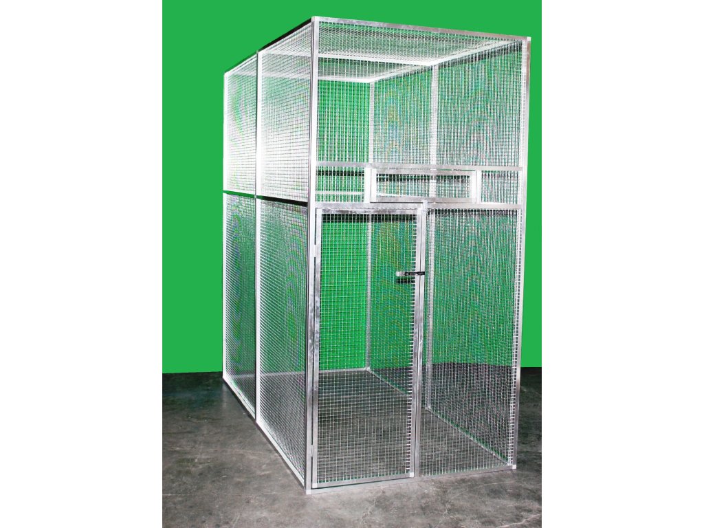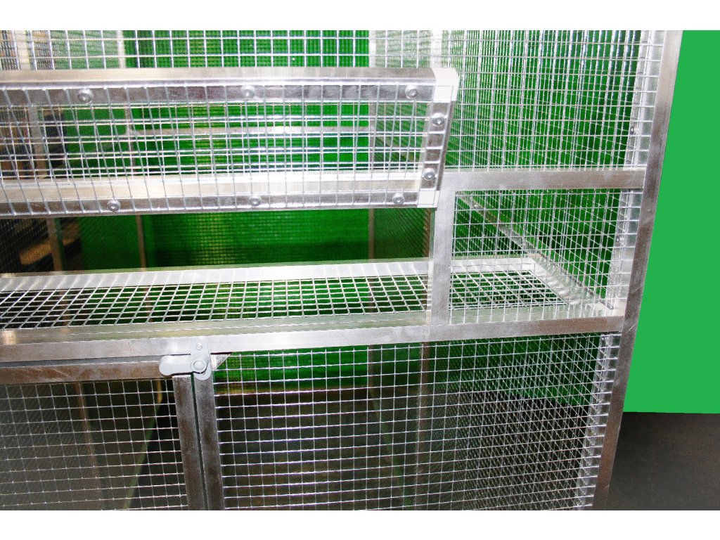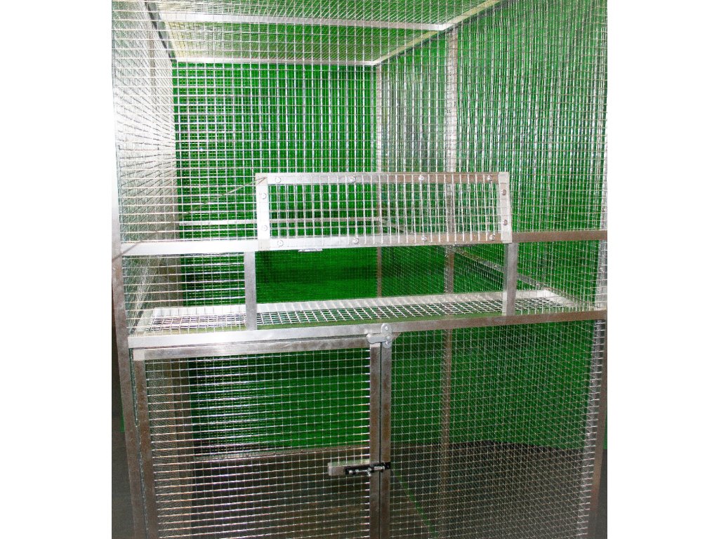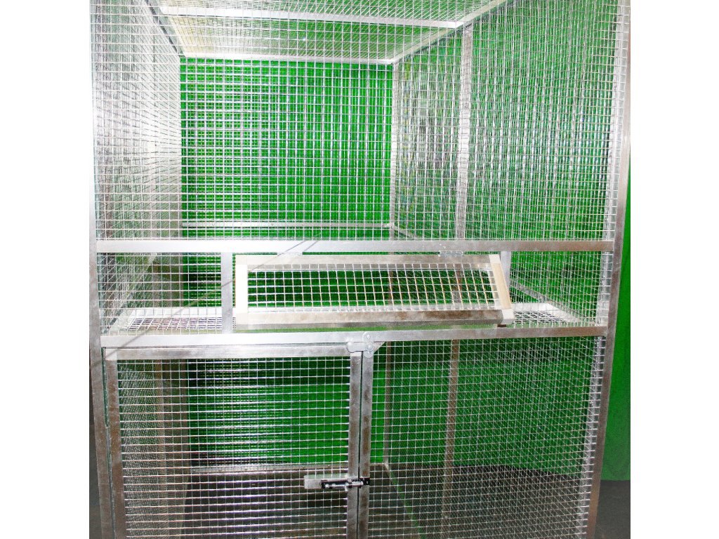 Jest pokrytasiatką Esafort 16 x 16 grubość drutu 1,20 mm. Na życzenie klienta można siatkę wymienić na inną z naszej oferty.Siatka w całej wolierze jest rozciągnięta od wewnątrz wolierze, i to z powodów estetycznych. Przy tej wolierze znajduje się stół do karmienia przeznaczony na przykład na ceramiczne naczynia lub podobne miski na karmę. Ten blat jest przykręcony do ramy woliery. Konstrukcja lady jest wykonana z profilu aluminiowego, który jest pokryty siatką. Dostęp do tego blatu jest przez drzwiczki, które są umieszczone nad wejściem do woliery. Wolierę wysyłamy transportem paletowym za pośrednictwem umownego przewoźnika Toptrans lub PPL.Woliera jest bardzo szybka i łatwa do złożenia i ponownego rozłożenia. Po uzgodnieniu można zamiast siatki w niektórych ramach umieścić wypełnienie z kompozytu aluminiowego, twardego PVC lub pleksi.Parametry dodatkowe