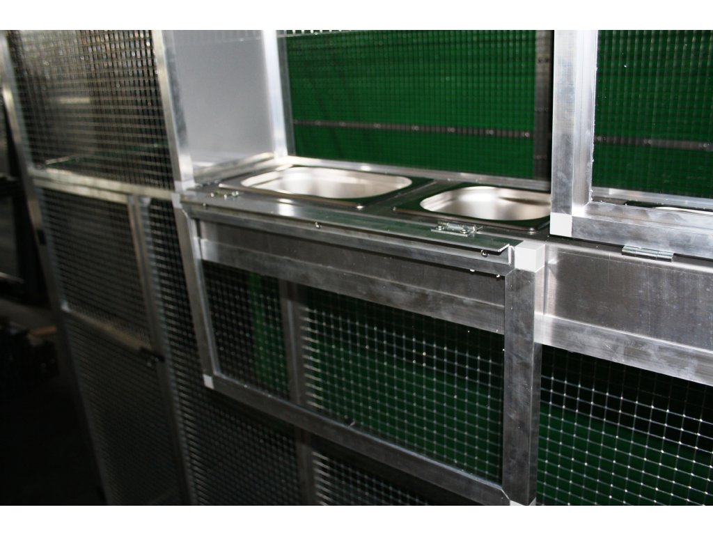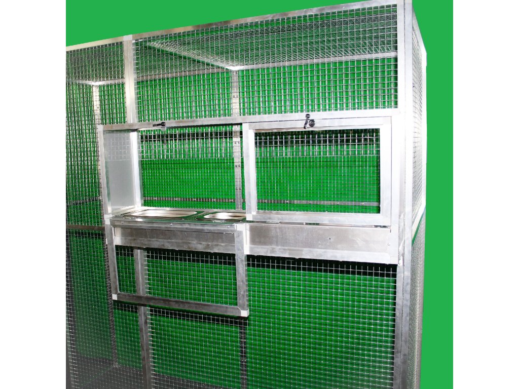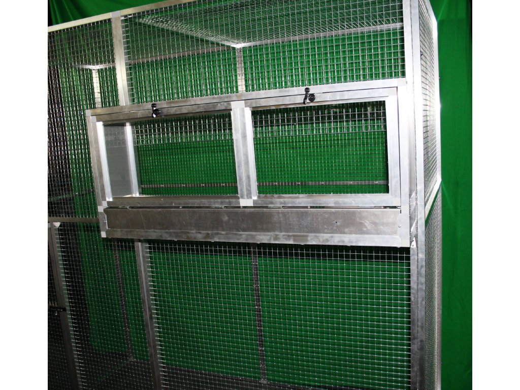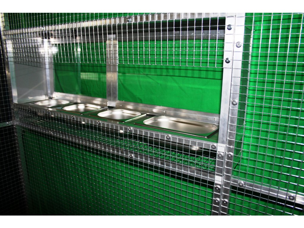 Na życzenie klienta można siatkę wymienić na inną z naszej oferty.Siatka w całej wolierze jest rozciągnięta od wewnątrz wolierze i to z powodów estetycznych. Ramy woliery są skręcone śrubami M6. Do ramy są nitowane aluminiowe gwinty. Karmnik jest umieszczony w oddzielnym pudełku, które jest przymocowane do ramy woliery. Pudełko zawiera w sumie trzy pojemniki gastronomiczne. Głębokość tych naczyń może wynosić 60mm lub 30mm. To zależy, dla jakiego ptactwa lub zwierzęcia będzie służyć woliera. Podczas zamykania drzwiczek w skrzynce paszowej dochodzi do zabezpieczenia pojemników gastronomicznych przed wyciągnięciem misek z lady na zewnątrz.Wolierę wysyłamy transportem paletowym za pośrednictwem umownego przewoźnika Toptrans lub PPL.Woliera jest bardzo szybka i łatwa do złożenia i ponownego rozłożenia. Po uzgodnieniu można zamiast siatki w niektórych ramach umieścić wypełnienie z kompozytu aluminiowego, twardego PVC lub pleksi. Woliera z zakrytym karmnikiem, Karmnik jest umieszczony na zewnątrz woliery.U nas taki box nazywamy klasycznie „bufet”.Parametry dodatkowe