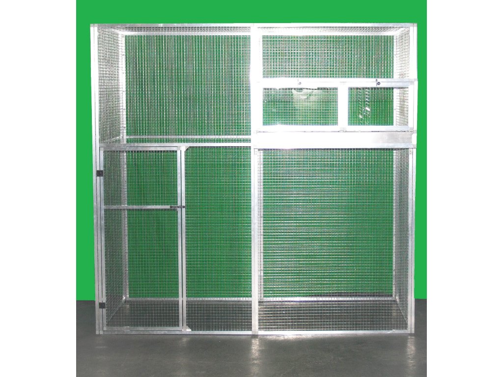 Woliera o wymiarach: głębokość 105cm, wysokość 200cm, szerokość 200cm składa się z siedmiu ram i jest pokryta siatką Esafort 19x19x1,45 mm.