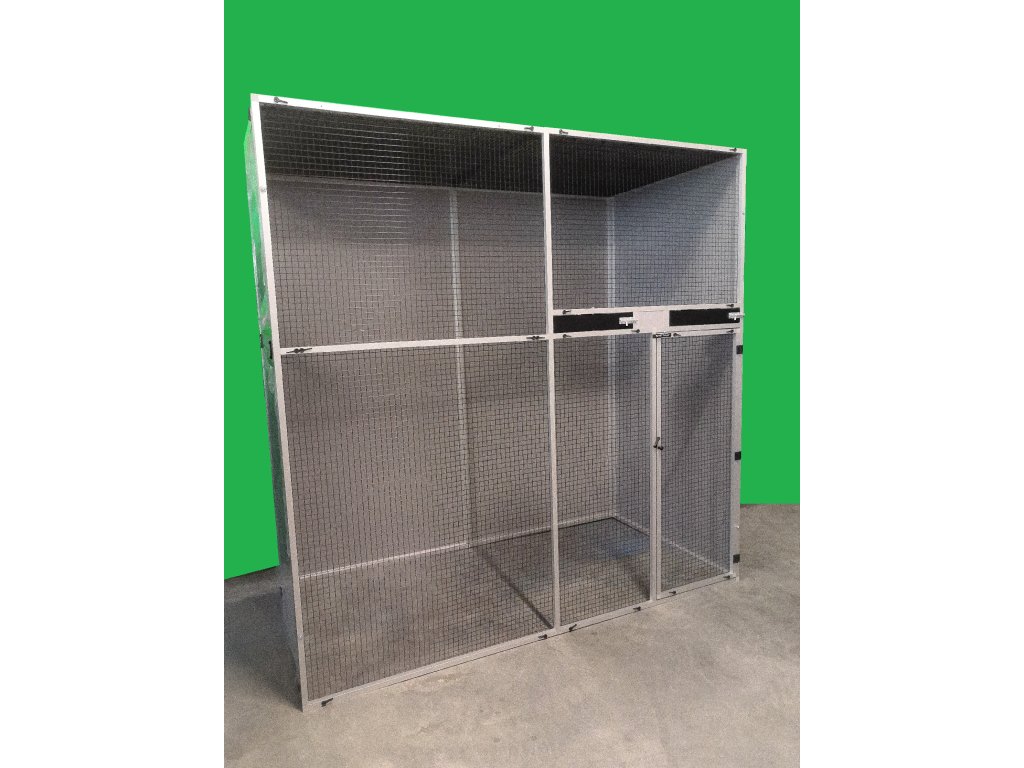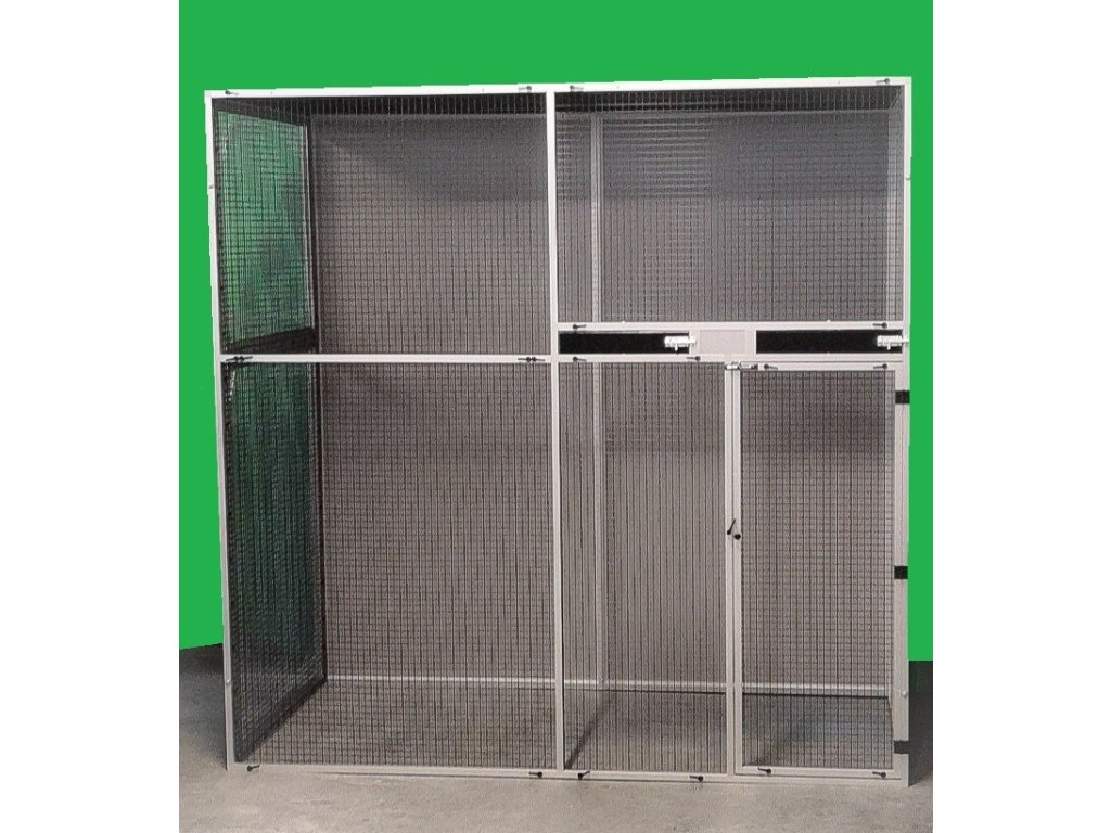 Drzwiczki do woliery mają wysokość 120 cm, szerokość 55 cm.Tylna ściana i lewa boczna ściana są pełne. Na te ściany użyty jest materiał, który nazywamy aluminiowym sandwich, który jest włożony do profilu. Sufit również jest pełny. I tutaj użyto aluminiowej kanapki, która jest przymocowana z jednej połowy do ramy. Druga połowa sufitu jest pokryta czarną siatką. Na życzenie klienta kolor wypełnień może być biały, antracytowy, zielony, żółty lub srebrny, jak widać na obrazku.W ramie nad drzwiczkami umieszczone są dwa aluminiowe obrotowe stoły do karmienia. Jedno stanowisko karmienia z dwoma miskami ze stali nierdzewnej o pojemności 0,35l (KPM02). Drugi karmnik przeznaczony na wodę, jest z jedną miską o pojemności 0,75l (KPV01). Woliera jest pokryta siatką Esafort 19x19x1,45mm w kolorze czarny mat. Siatka w całej wolierze jest rozciągnięta od wewnątrz wolier z powodów estetycznych. Cała woliera jest skręcona śrubami nr 6. do ramy są nitowane gwinty nierdzewne.Wolierę wysyłamy transportem paletowym Toptrans.Woliera jest bardzo szybka i łatwa do złożenia i ponownego rozłożenia.Parametry dodatkowe
